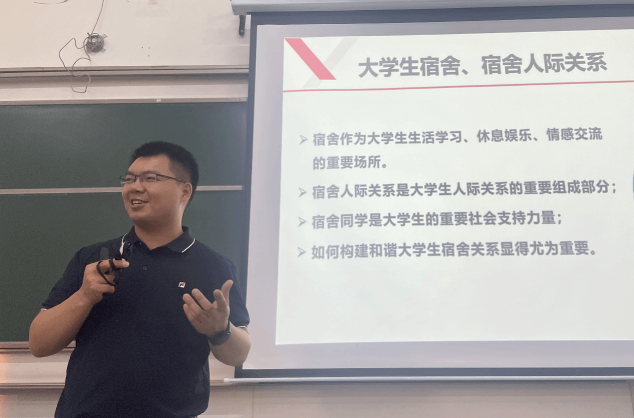 讲座开始,余金聪副教授阐述了宿舍关系的重要意义。他指出,宿舍作为大学生在校的主要生活场所,良好的宿舍人际关系对同学们的心理健康、学业发展乃至未来的社会适应能力都有着深远影响。接着,余金聪从心理学角度对人际互动进行了解释。他运用专业的心理学知识和生动的案例,深入浅出地剖析了人际互动中的心理机制,让同学们对日常宿舍生活中的人际行为有了更深刻的认识。在讲座的核心部分,余金聪提出了从冲突到共融的四维策略,围绕这四个维度,他详细讲解了在宿舍生活中面对矛盾冲突时,如何通过有效的沟通、理解、包容和合作,实现宿舍成员间关系的和谐共融。