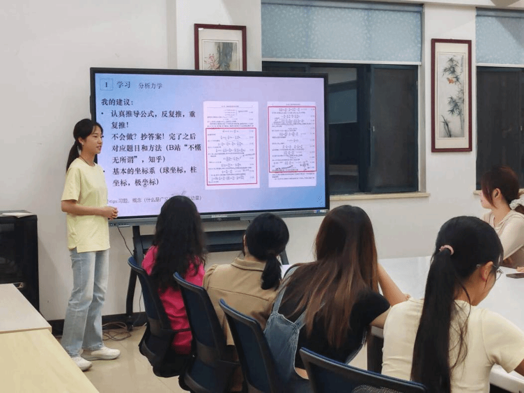 吴茜茜学姐上台分享学习经验时,重点强调学习中要明确自身定位及目标。针对本学期的专业课,她建议通过制作思维导图、对比图梳理知识点;学习分析力学时,要认真推导公式,掌握基本的坐标系;而对于原子物理,则需要理清概念,熟记公式等等。谈及平衡学业与学生工作时,她建议同学探索个人兴趣与专业发展的契合点,以周计划表落实短期目标,用成就日记保持长期动能,真正实现“日日有进益,步步皆笃行”。