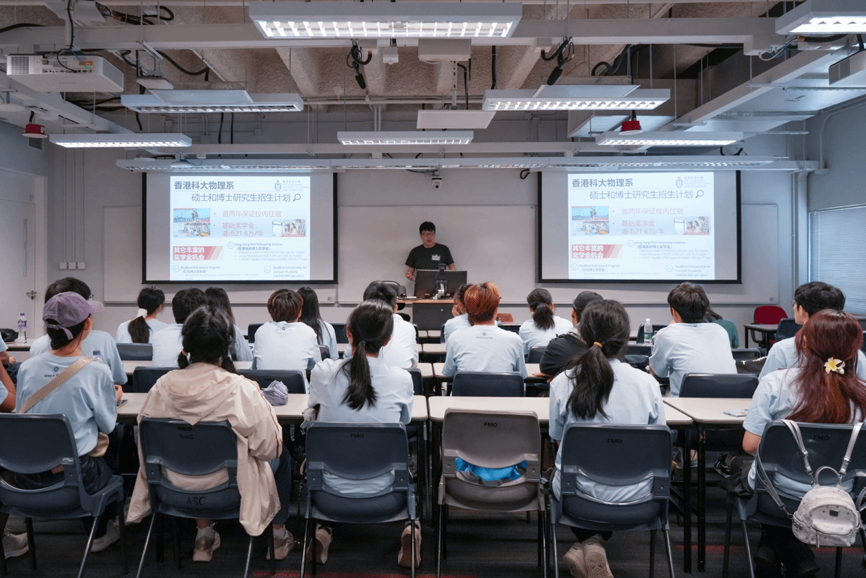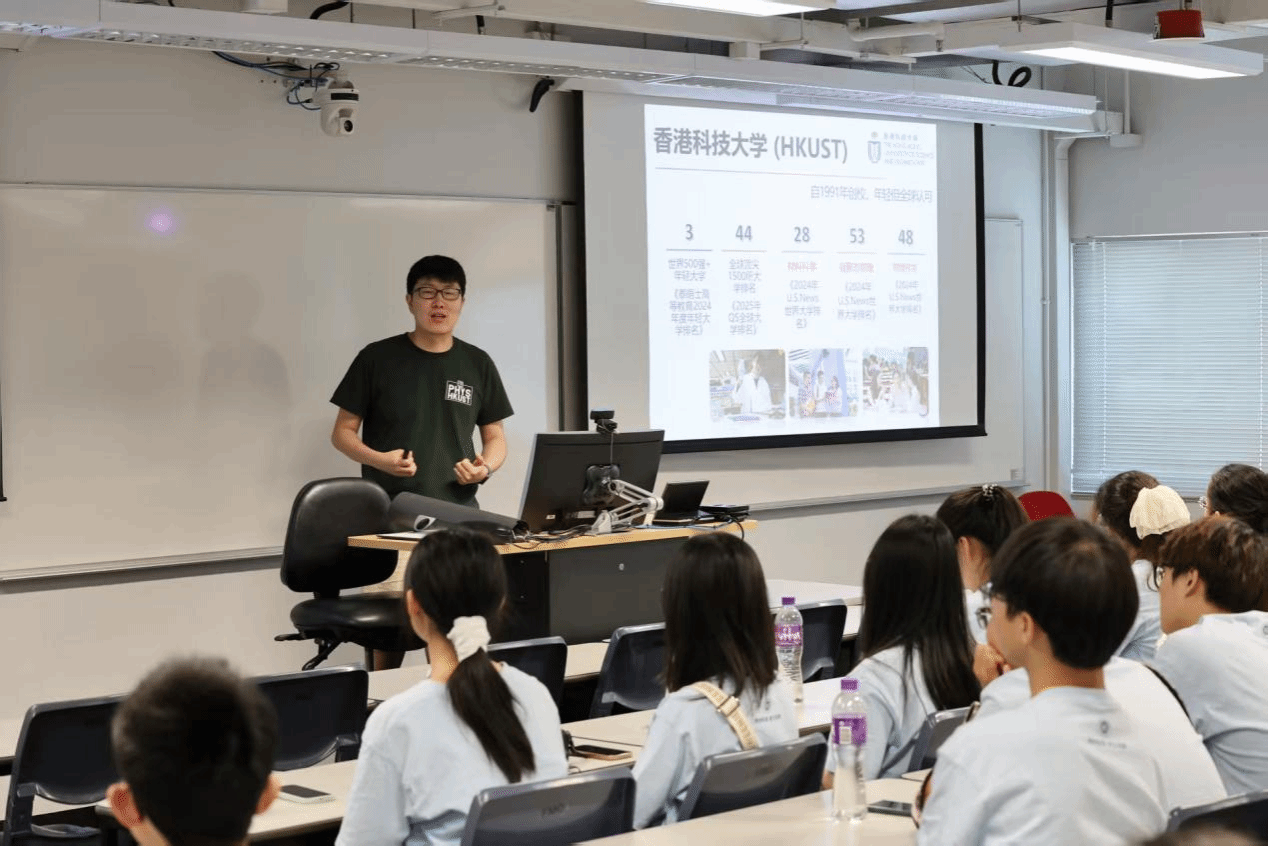 上午,实践队首先走进港科大课堂,该校物理系张璟迪教授向队员们生动讲解了学校发展历程与人文风景,同时系统介绍了港科大物理系的师生规模、人才培养体系、研究前沿以及招生情况等,通过聆听报告,队员们对这座亚洲顶尖学府有了立体认知。