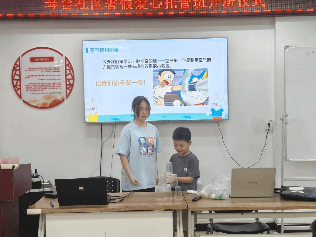 下午由实践队员王晓田带来“愤怒的空气炮”特色课程。通过自制空气炮装置演示,引导学生观察涡环现象:“当气球回弹压缩空气时,高速气流形成旋转涡环,这种稳定传播的空气团能击倒数米外的纸杯塔。”课程结合海豚吐泡泡、烟圈飞行等生动案例,深入讲解伯努利原理与能量守恒定律。在实践环节,学生们分组测试不同开口形状空气炮的效果,现场惊呼声与掌声不断。