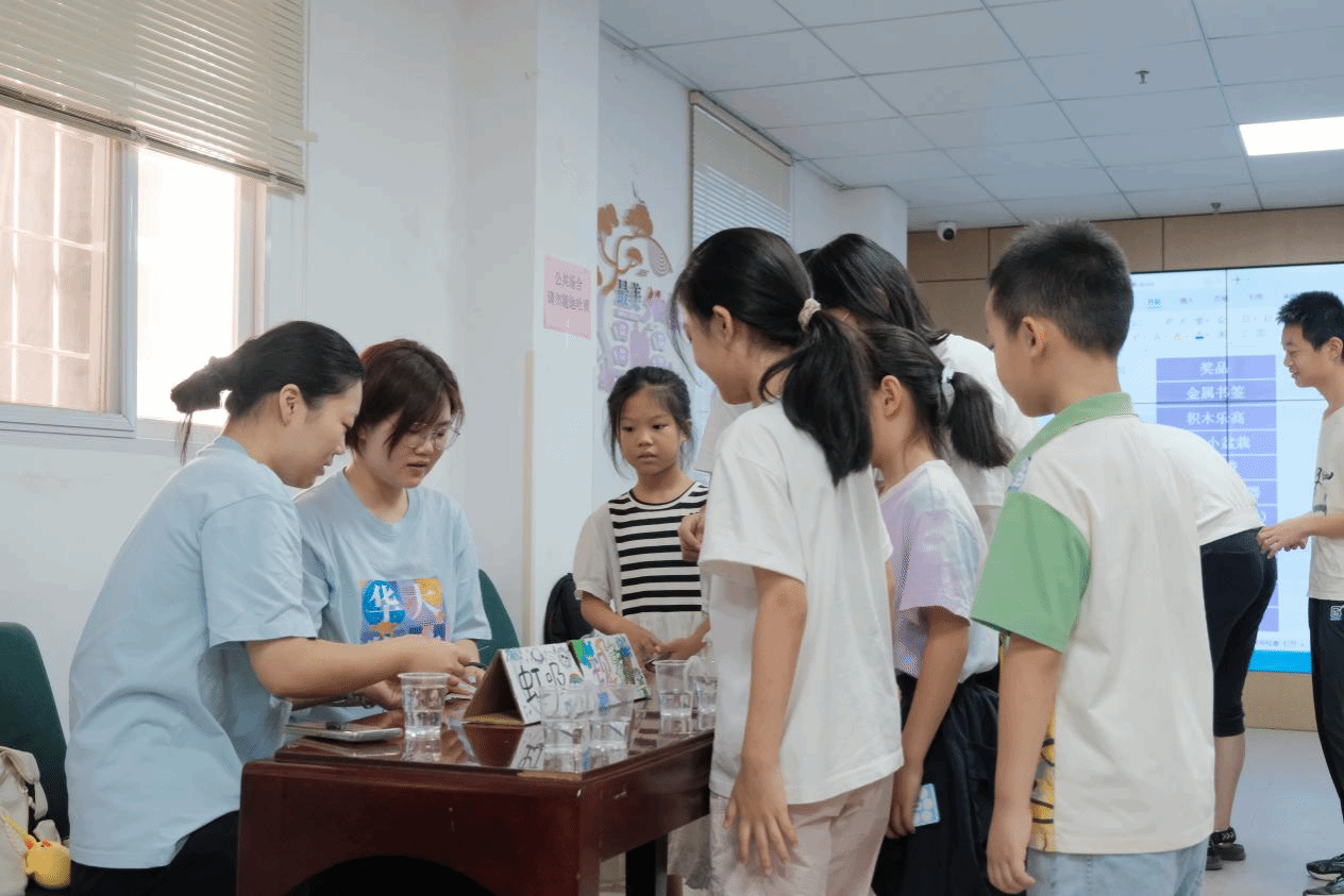 实验结束后,孩子们凭集章卡兑换奖品,笑脸中洋溢着成就与喜悦。最后孩子们与实践队员们合影留念。