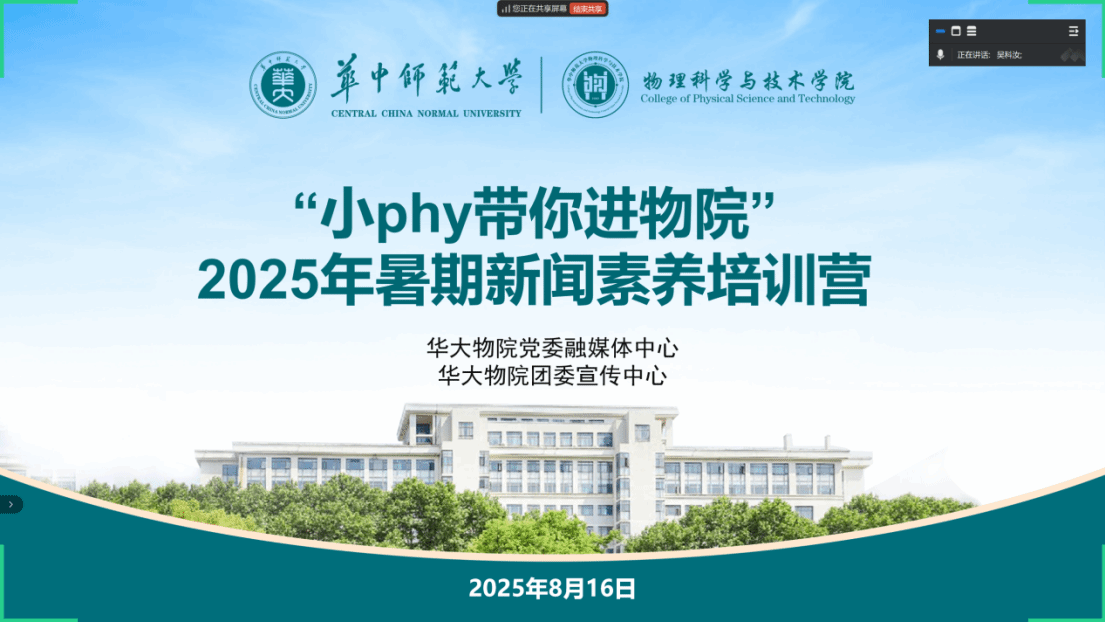 为了进一步发挥二级融媒体试点单位的示范引领作用,增进 2025级新生对学院宣传工作的全方位了解,同时为学院宣传工作队伍储备后续力量,8月16日至18日,学院以线上形式开展了“小 phy 带你进物院”2025年暑期新闻素养培训营。本次培训营于每晚七点至八点半开展,全程参与培训人员共计29人。学院党委融媒体中心及团委宣传中心骨干成员担任课程主讲人,学院宣传干事王棣全程统筹指导。