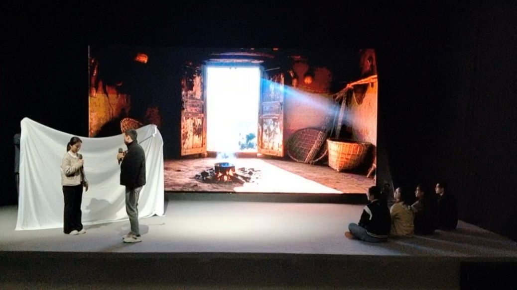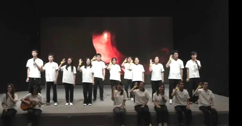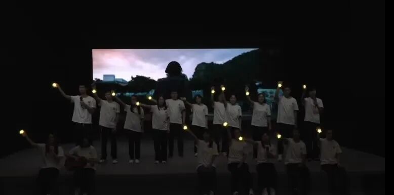 现场展演环节,2304班以《山花烂漫开,世界赠我“师”之名》为主题,通过情景剧、手势舞与合唱结合的形式呈现:演员借助影子幕布,再现山区学子突破“女娃早嫁”世俗偏见,在以张桂梅老师为榜样的“燃灯育魂”式的教育者感召鼓励下坚定求学的故事;《夜空中最亮的星》高潮段落响起时,主唱团队伴吉他演唱,其余同学同步跳手语舞,全体成员手持星星灯轻轻摇晃,唱出一曲关于教育、信念与爱的颂歌,传达了“师范生”群体薪火相传的使命感与担当精神。