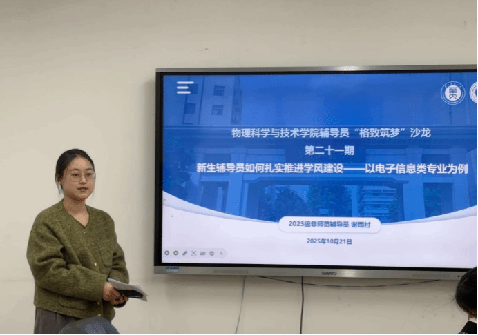 10月21日上午,物理科学与技术学院学工团队第21期“格致筑梦”沙龙在9号楼535会议室进行。学院党委副书记马英和全体专兼职辅导员参与研讨。本期沙龙以《新生辅导员如何扎实推进学风建设——以电子信息类专业为例》为题,由学院2025级非师范专业辅导员谢雨村主讲。
