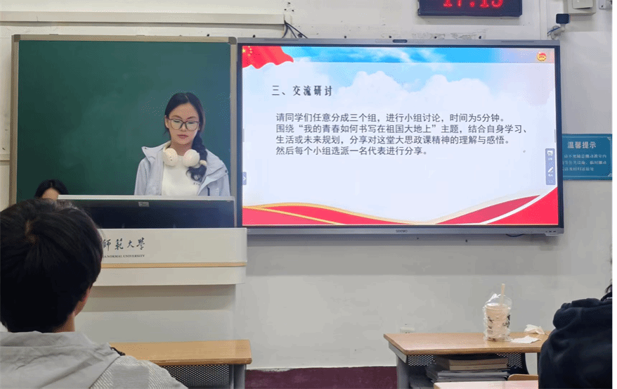 第三部分是交流研讨。围绕“我的青春如何书写在祖国大地上”主题,团支书组织团员分组讨论。团员们结合自身学习、生活或未来规划,分享对大思政课精神的理解与感悟。每组选派代表进行成果展示。