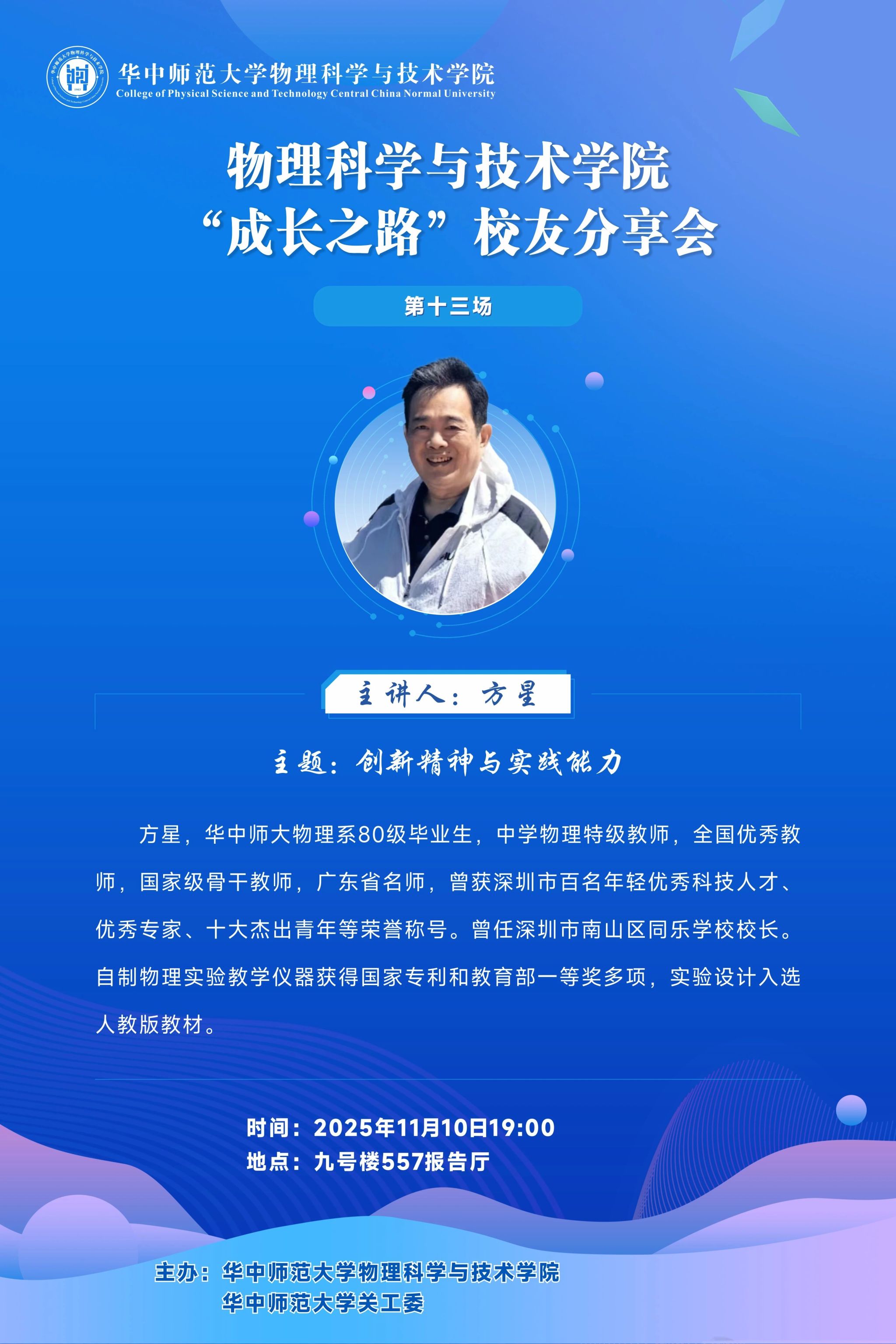 11月10日晚,我院“成长之路”校友分享会第十三场在九号楼557报告厅顺利举行。80级优秀校友、中学物理特级教师方星应邀重返母校,围绕“创新精神与实践能力”这一主题,与在场师生分享了自己多年于教学与实践中获得的思考与成果。