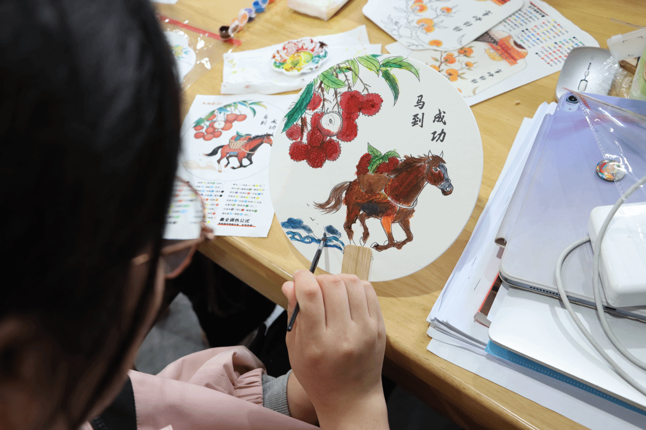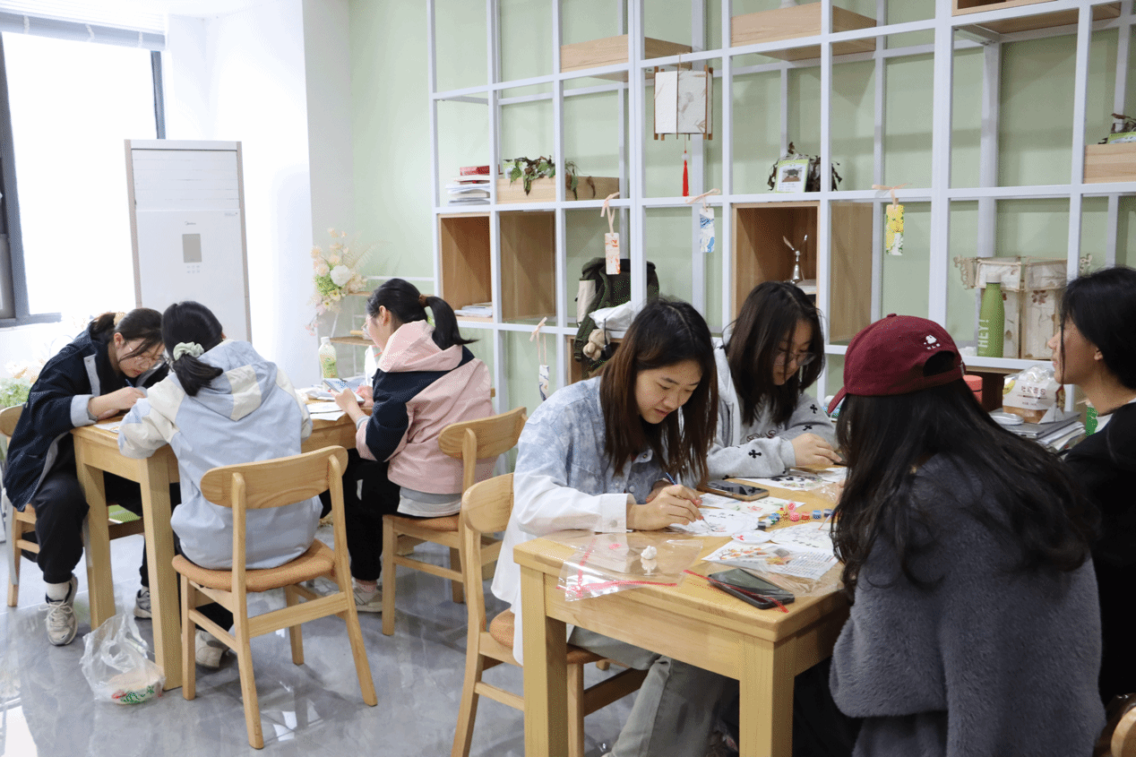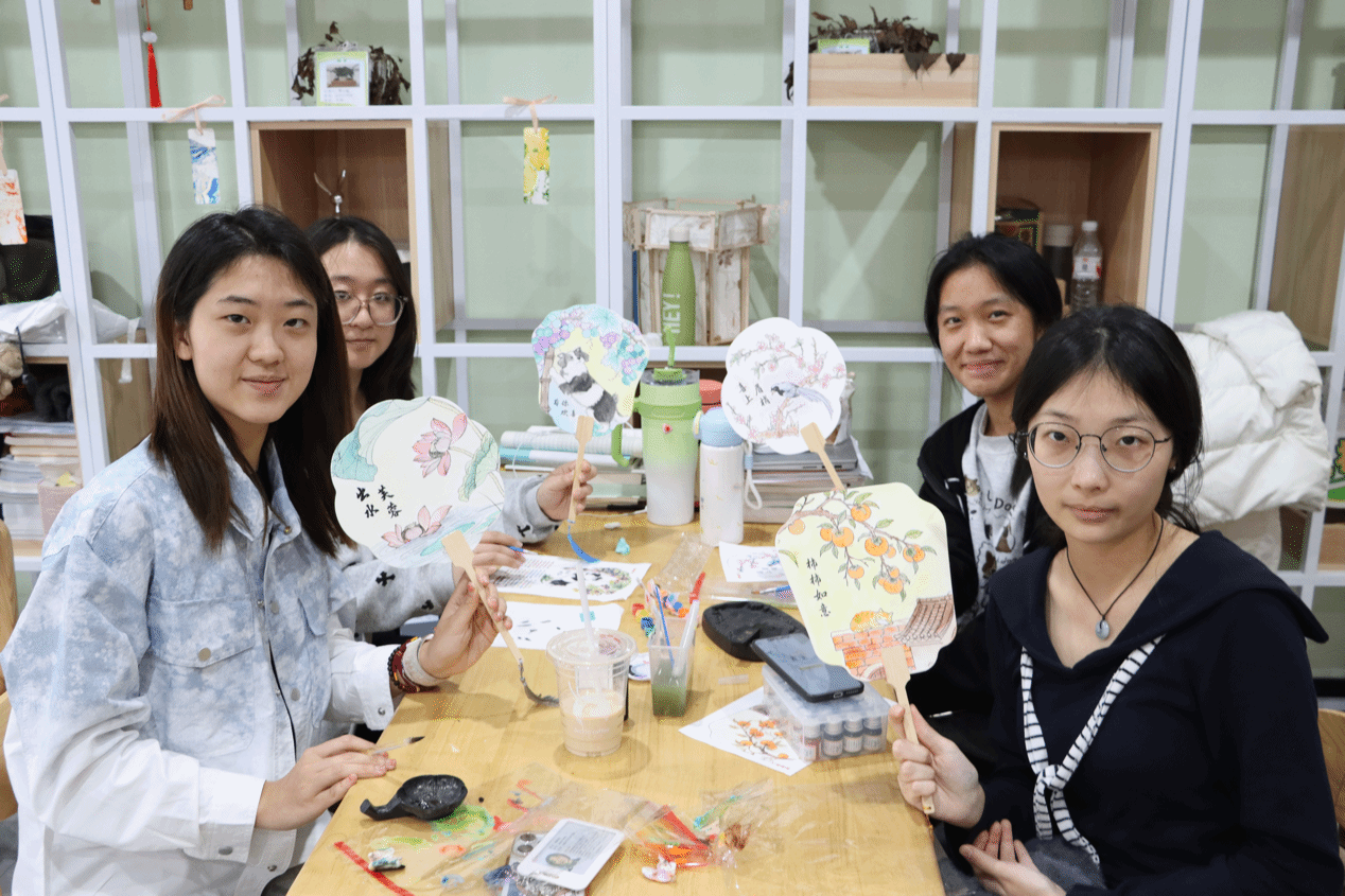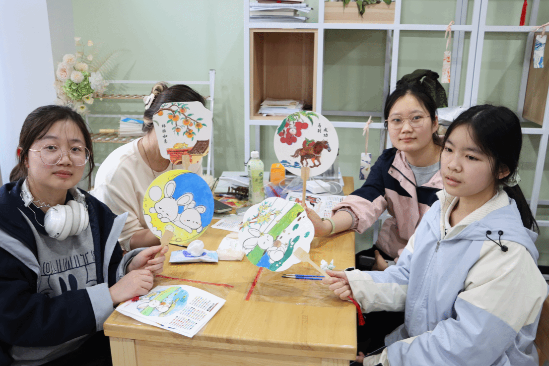 活动现场氛围轻松融洽,各宿舍成员围坐在一起,精心挑选图案、热烈商讨创作思路,创作过程中也互相分享配色方案、提出修改建议,一笔一划细心雕琢作品。一方团扇,既凝聚了同学们的创意与巧思,也成为宿舍成员间沟通审美、增进理解的情感纽带。