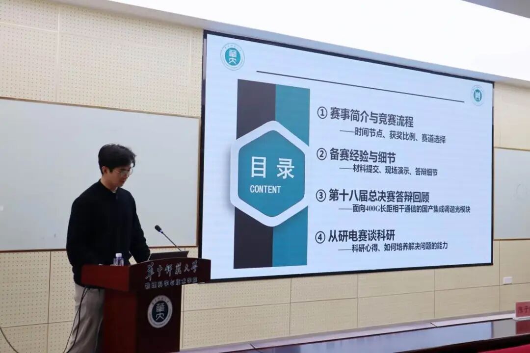 陈子枫老师以自己第十八届研电赛全国总决赛一等奖作品《面向400G长距相干通信的国产集成调谐光模块》为例,复盘了获奖作品的整体打造思路,为同学们提供了参赛参考。强调参赛作品要紧扣国家战略需求和行业痛点,明确作品的核心定位。他还结合自身经历,分享了从研电赛中沉淀的科研心得与成长感悟:竞赛获奖是优秀科研成果的附带品,急功近利追求奖项反而会偏离科研的初衷。