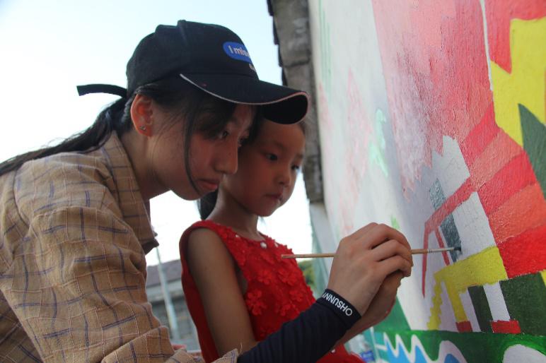 绘制过程中,不少村民和孩子围观绘制工作。“我也要像姐姐一样做一个画家!”潘婧如握着孩子的手一笔一划描绘美丽乡村时,十岁的小姑娘妮妮大声向队员们说。
