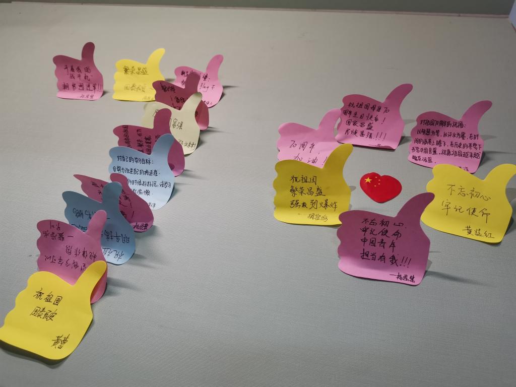 接着,在杨恩慧的带领下,支部成员在中共中央纪念馆门前以写便签的形式,在建国70周年之际留下自己的感悟和对祖国最美好的祝愿。支部成员唐洋洋写道:“以智慧为笔,以汗水为墨,在时间的画卷下腾飞,在历史的苍穹下书写中国昌盛!”其他支部成员纷纷写下本次重温革命的精神学习以及建设美好未来坚定的理想信念。