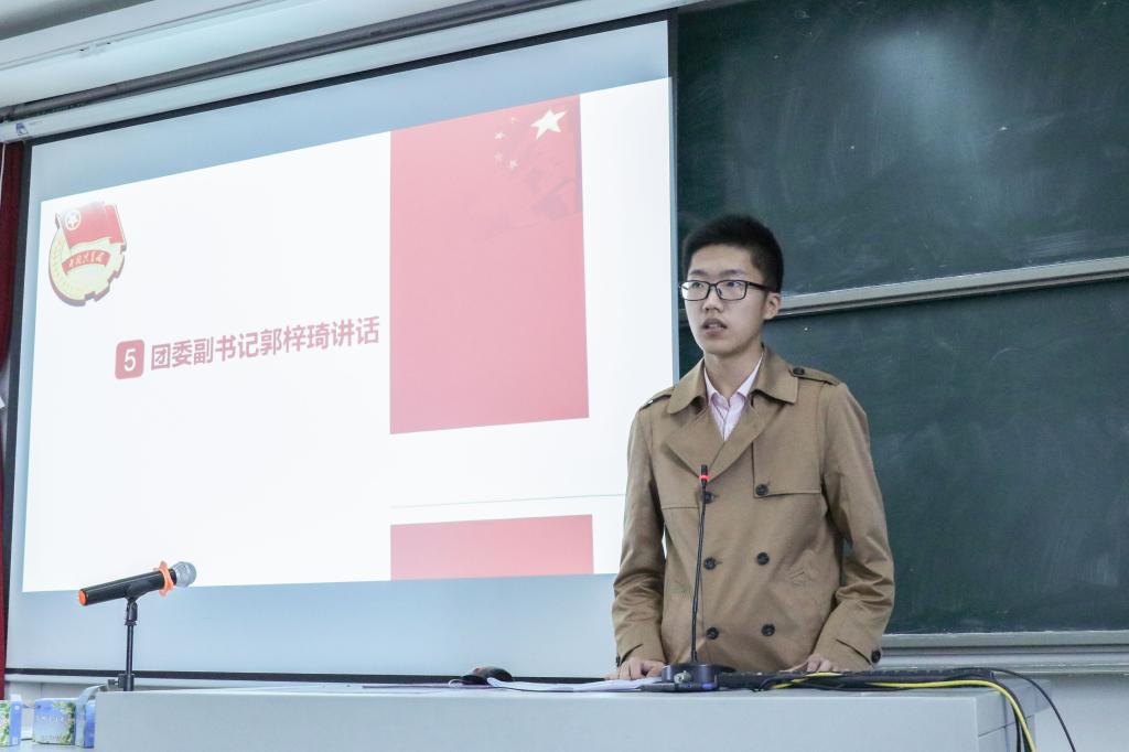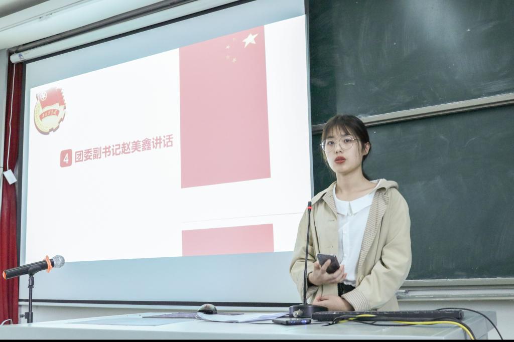张陈鑫对主题为“与国同奋进,青春献祖国”的十月份团日活动进行介绍,并就活动内容以及活动形式举例,鼓励探索有趣又有富有意义的活动。他以一副对联进行总结:“与国同奋进,开华夏千秋盛举,青春献祖国,展神州万古雄风。”