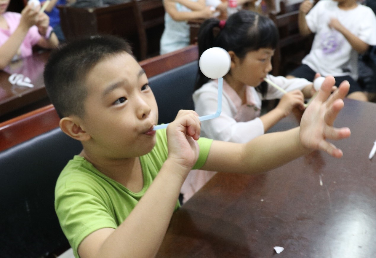 “用吸管吹乒乓球,乒乓球会飞走吗?”谭吉馨用这样一个问题引入了今天的热力学小实验。许多小朋友都认为乒乓球会被气流吹走,老师想由此建立认知冲突,加深孩子们的印象,建立物理概念。小朋友们跟着老师的思路,做了一系列实验,通过亲身经历知道了乒乓球会被吸住是由于压强的作用,并用乒乓球和吸管体验了压强的奇妙之处。