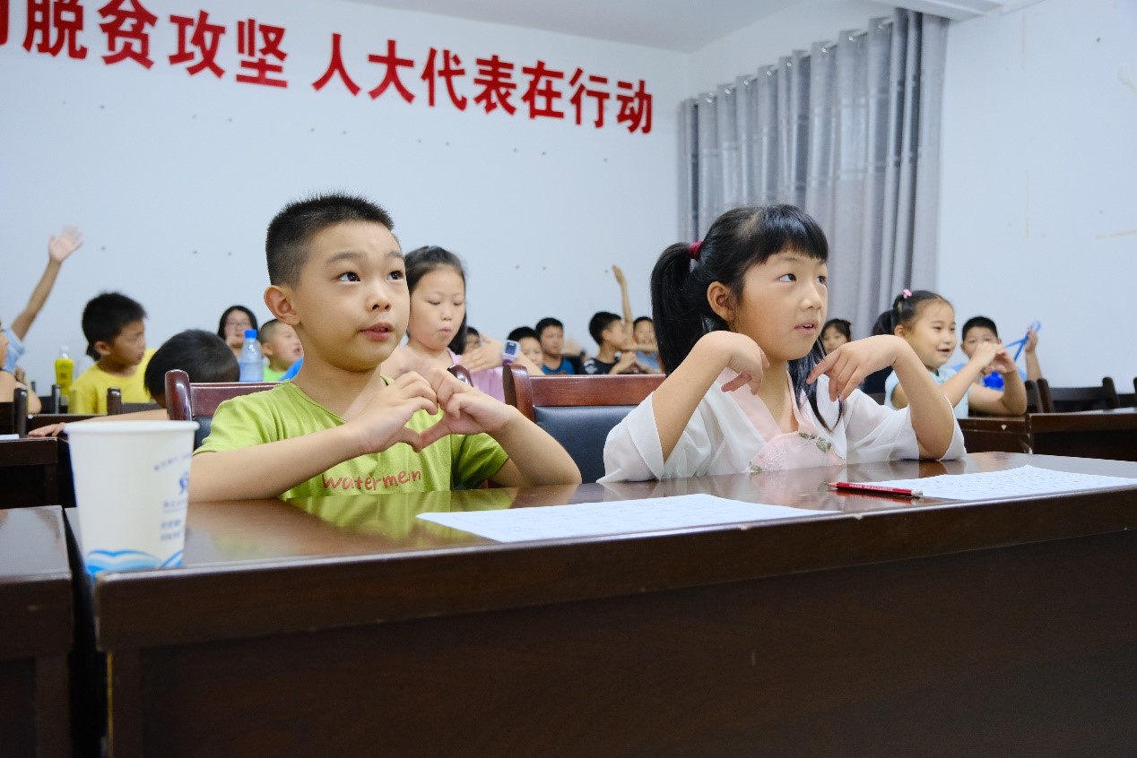 “两棵小树十个杈,不长树叶不开花,写字画画都用它,干起活来顶呱呱”,实践队队员刘禹畅用这样一个谜语迅速吸引住了小朋友兴趣,引出了今天的主题——手语。