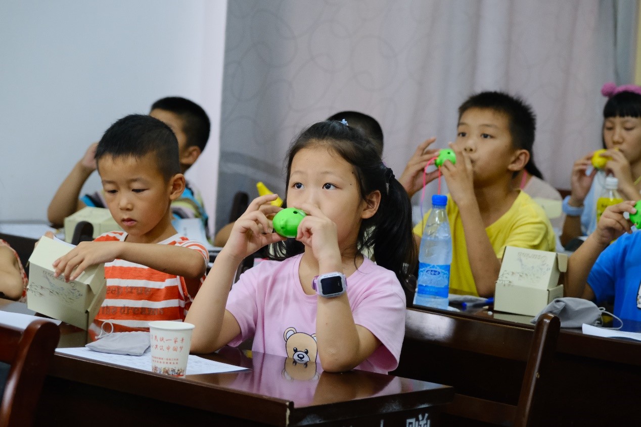 今天,实践队队员姚林宏还为小朋友们带来了一个特殊的礼物——陶笛。他从陶笛的历史和分类开始讲起,带领小朋友们一步步了解陶笛的知识,走进陶笛的世界。接着,姚林宏播放了一个6岁小朋友用陶笛吹奏《夜空中最亮的星》的视频,并告诉同学们“一个人只要对一个东西感兴趣、有毅力坚持下去,年龄不是阻碍,大家都能在自己喜欢的领域像星星一样闪闪发光。”随后,他指导着小朋友们学习和演奏《小星星》这个曲目。或许小朋友们演奏出的歌曲没有那么完美,但大家热情高涨,每一个小朋友的脸上都洋溢着笑容,这节课在小朋友们演奏出的音乐声中结束。