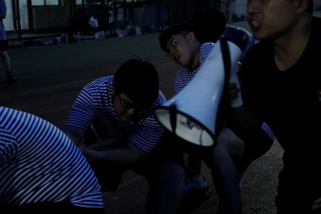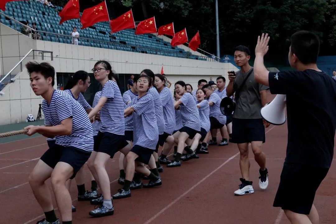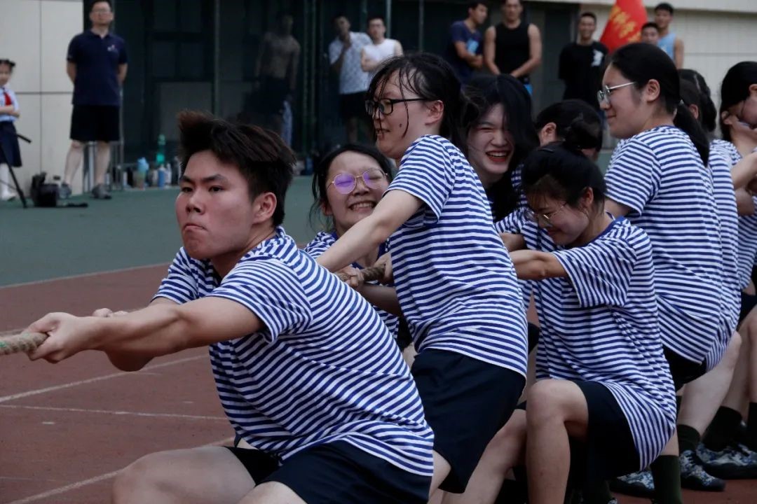 第一场对战新闻传播学院,全连到达指定位置,比赛队员各个精神抖擞咬紧牙关,身体重心向后仰,眉头紧锁,看向前方。一声令下,队员们以排山倒海之势迅速向后拉。同学们的呐喊声如潮水般向前方涌去,将整个操场包围、淹没。作为物院的首场比赛,同学们还没有太多的经验,比赛一度陷入焦灼,象征着胜利的铃铛在中央红线处左右晃动。这时,连长吴俊杰拿起话筒,站在队员身边,一遍又一遍呐喊“向后!向后!向后!”并侧身弓步指挥队员们向后用力。铃铛开始渐渐向我方倾斜,全体队员团结一心向对手发出最后的攻势。伴随着清脆的哨声,指挥员举起左手,喊出“物理学院获胜!”