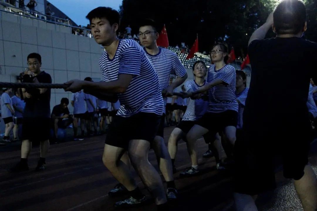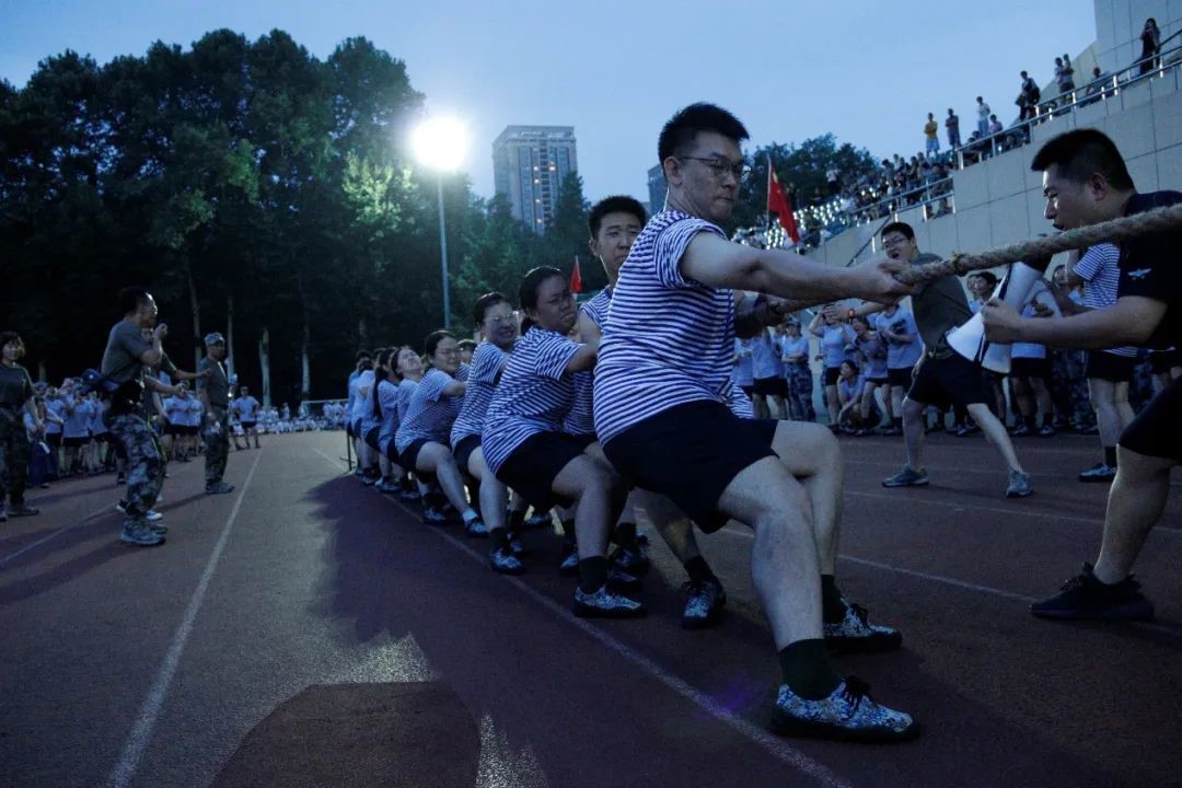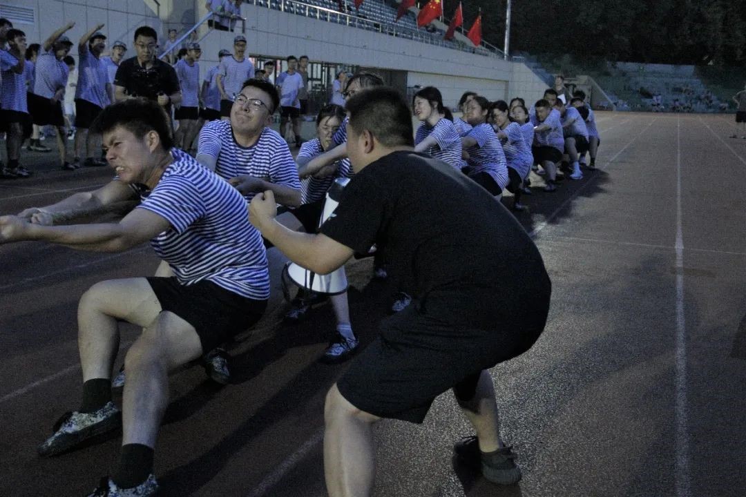 裁判员一声令下,伴随着震耳的加油呐喊声,金色的铃铛左右摇晃,牵动着在场师生的心…… 6月26日晚18:00,十九连全体学员在佑铭体育场参加了一场激动人心的拔河比赛。全校共有23个连队参加比赛,比赛规则为各学院派出10男(固定)12女(不定),每局上场8男12女(共20人),比赛中途不得更换选手,每局比赛间隙男生可从10人中替换2人,女生可以自由替换,比赛采取三局两胜制。