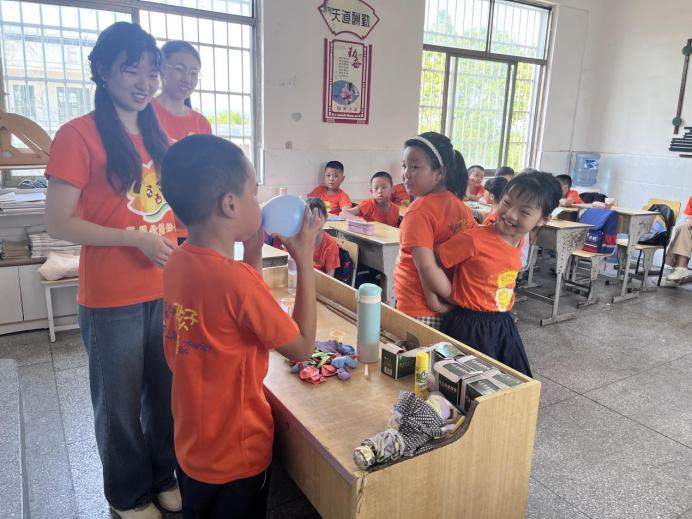下午,在班主任志愿者的组织下,各班级分别在课室内举行师生见面会。见面会将自我介绍与游戏环节相结合,学生们积极参与,妙趣横生。“击鼓传花”,鼓声渐停,气氛紧张;“你划我猜”游戏,志愿者精彩的模仿与学生默契的作答博得了满堂喝彩;“协力吹运踩”游戏,师生们通力合作,争分夺秒完成了吹气球、运气球与踩气球的环节设计。“手口不一”游戏,“萝卜蹲蹲”游戏,“五毛一块”游戏,策划多样,趣味盎然。几轮游戏后,学生们与志愿者们建立了良好的联系。见面会的成功举办,增进了学生对本次夏令营的认识,帮助学生和志愿者们融入这个相伴成长、共同进步的大家庭。