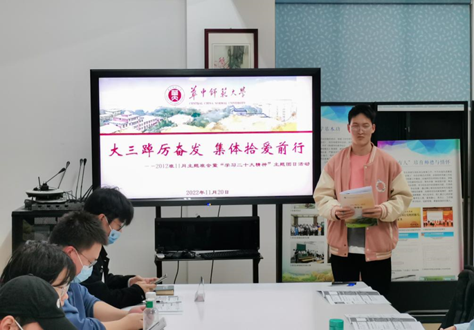 活动前,2012班班委已将班级前两年的集体成果与每位同学的个人简历制作成册,会上每位同学人手一本《2012班大三阶段简历册》。班长梁婧妤首先介绍班级简历,开启了班会的序章。梁婧妤带大家共同回顾两年多来班级一起走过的历程——班级组成、集体荣誉、班委更替、各次班会以及团日活动等。接着,预备党员、2020级党员先锋队队长赵卓伟以“贵师重傅,科教兴邦”为主题宣讲党的二十大精神,他从教育、人才、科技创新方面入手,紧密结合未来教育工作者的身份,深入阐述自己的思考。