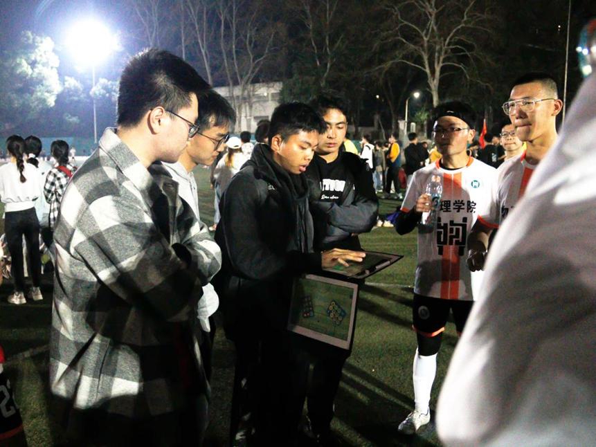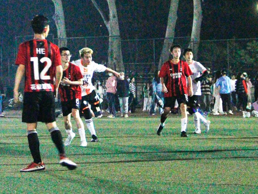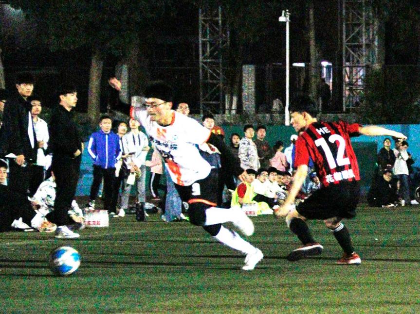 晚上19:30,随着主裁判一声哨响,两队展开最后的冲击。双方都攻势猛烈,不甘示弱。我院男足队员们配合默契,强势进攻,在压迫对方的同时,注意回防,多次迅速地拆解了对方的攻势。在比赛过程中,双方都有一些打破僵局的机会,只可惜都未能把握住率先破门的良机,上半场比赛难分胜负。