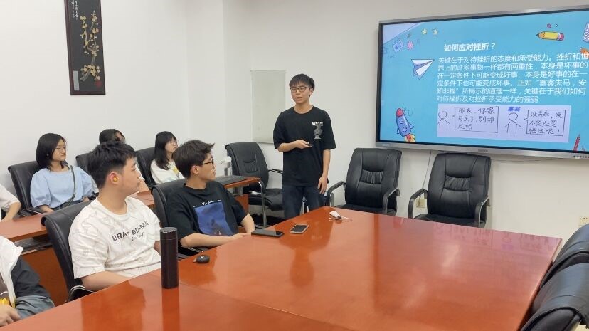在交流分享环节,朱少捷同学分享他在篮球队的经历。由于种种客观因素,他未能如愿参加近期的篮球比赛,这使他感到烦恼和沮丧,也开始怀疑自己的能力。但是经过自我疏导并与教练沟通,他认识到这次挫折恰恰说明他需要在平时加强锻炼,提升自己,才能在关键时刻把握机会。朱少捷同学的分享也引起了在场同学们的共鸣,同学们一起探讨了应对挫折、调节情绪的常见方法。