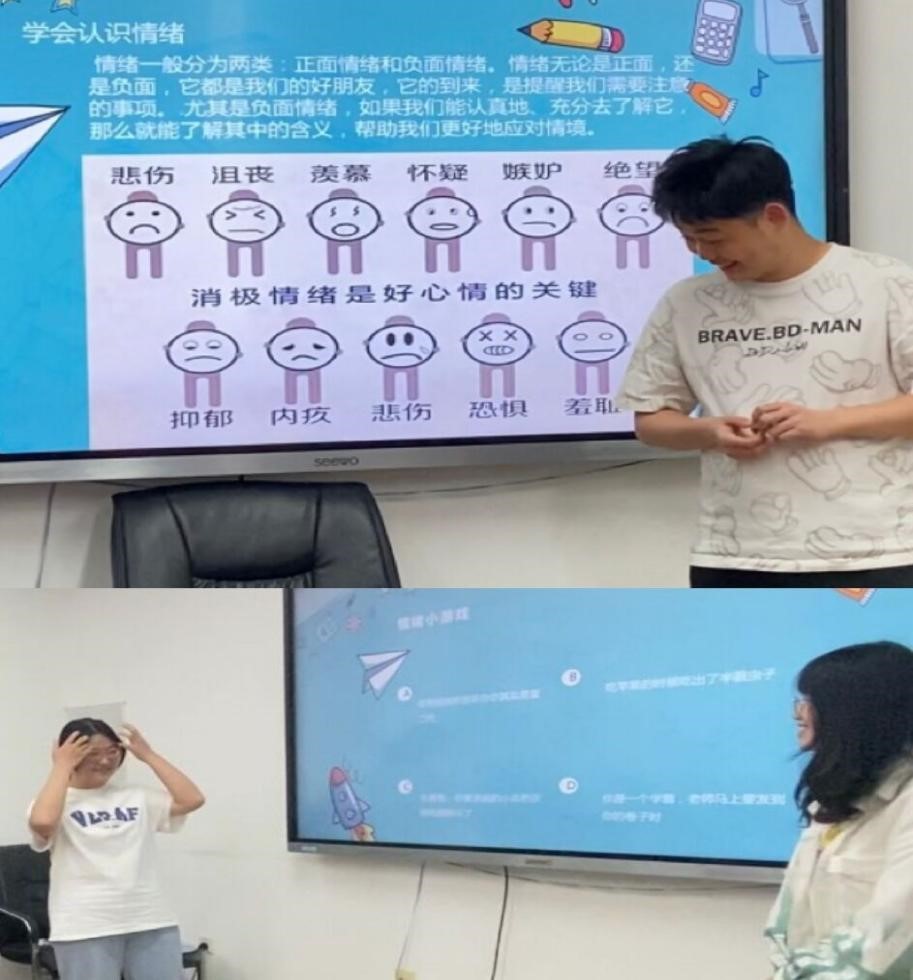 在游戏环节,陈振宇带领同学们玩日常放松的小游戏,游戏内容与心理学现象结合,旨在引导同学们在畅玩游戏的过程中思考心理活动的变化,体会和学习调节情绪的方法。
