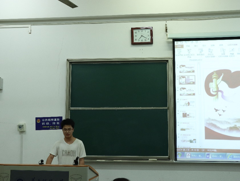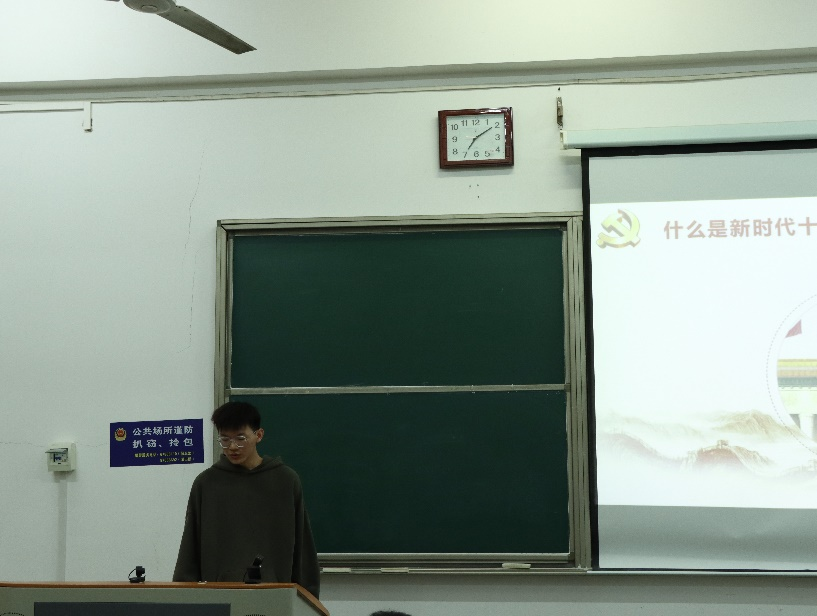 活动开始,全体同学起立奏唱共青团团歌。2104班团支书潘梦明为大家宣讲中国特色社会主义进入新时代后的相关国家政策和城市面貌,以东莞为例以小见大,让同学们直观感受到国家进入新时代后的巨大变化,并从中了解国家为完成脱贫攻坚,实现全面建成小康社会所做出的不懈努力。潘梦明总结了党的二十大报告中所指出的三件大事,并鼓励同学们坚定历史自信,把握历史规律,掌握历史主动,阔步新征程。