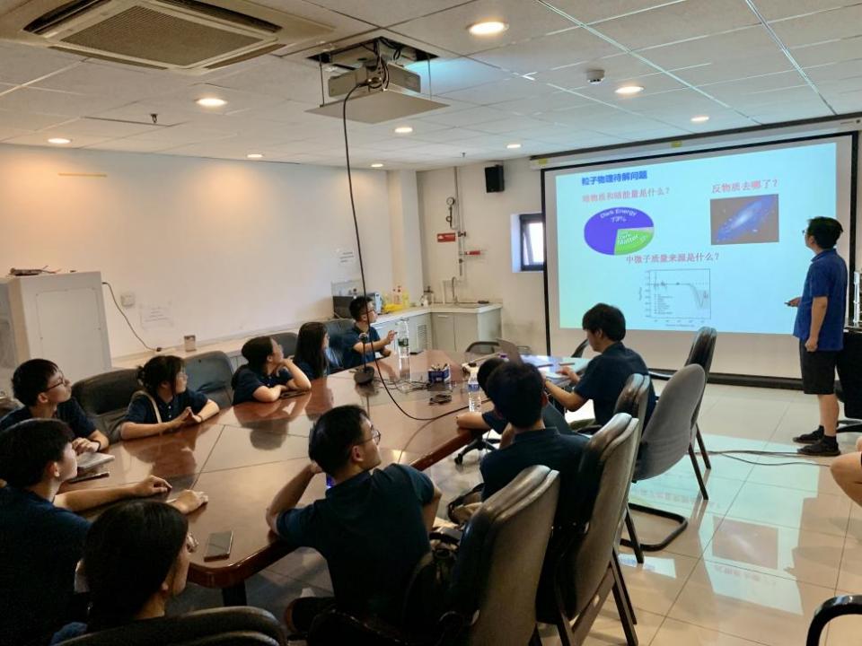 下午,实践队来到清华大学工程物理系。张黎明老师就清华大学所参与的粒子物理相关研究装置向实践队成员作报告。针对粒子物理领域的待解问题:暗物质和暗能量是什么、反物质去哪了、中微子质量来源是什么,张黎明分别做出描述和分析。张黎明重点介绍了中国锦屏地下实验室的建设和相关实验,为实践队成员开阔了科研视野。最后,队员韩邢超、王星琪向张黎明提问,就暗物质的研究进行了探讨。