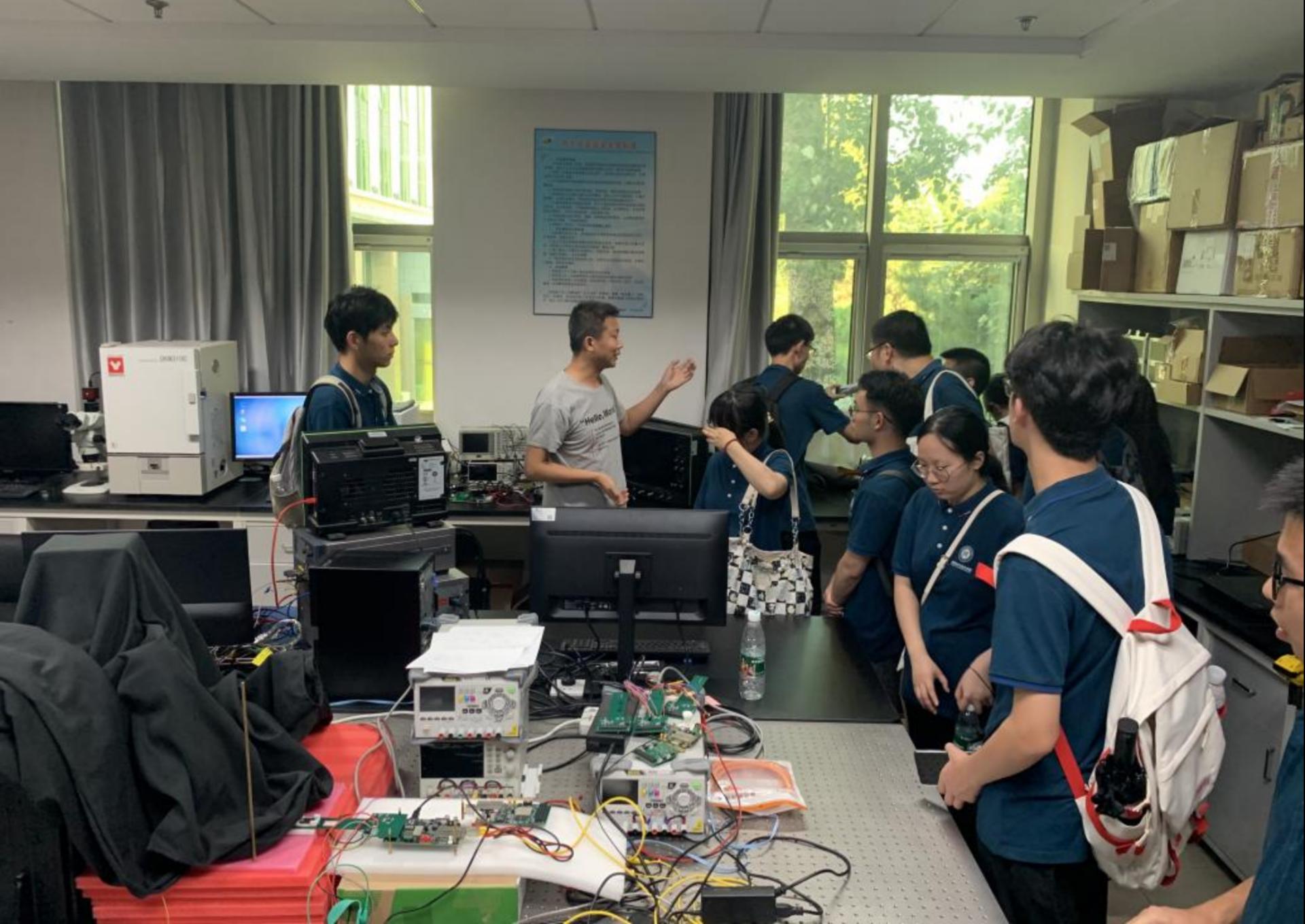 实践队还参观了电子学实验室。负责研发硅探测器的刘佩莲老师带领队员们进入实验室。队员们第一次穿上防护服,第一次通过风淋间,看到了实验室里正在研发的探测器结构以及实验器材。最后,高能所的张杰老师介绍了很多基础的电子学设备元件和现在高能所正在进行的电子学芯片研发工作。