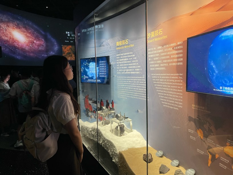 7月13日上午,实践队前往上海天文馆参观。队员们参观了馆内布置的“家园”“宇宙”“征程”三个主展区。在“家园”展区,太阳、行星和小行星的模型依次排开,队员们通过展板与互动装置的方式了解了太阳系内天体的信息以及特殊宇宙现象的知识;在“宇宙”展区,银河系、可观测宇宙、尺度和宇宙学知识次第展示,队员们将展板的知识与所学的物理学科结合,加深了对天文和物理紧密联系的理解;而在“征程”展区,人类探索和理解宇宙的曲折历史如画卷般展开,航天器的模型精巧夺目,队员们进一步理解了探索精神和人类的航空航天成就。