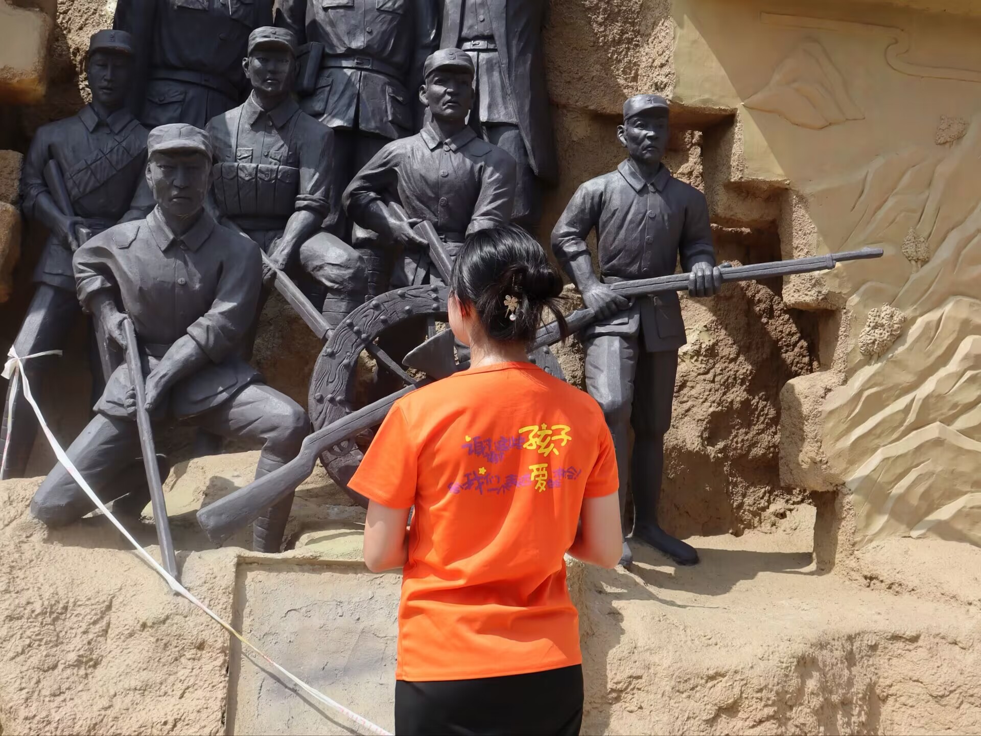 中原突围,肃然起敬。支教队队员来到中原突围玉皇山战斗纪念馆,映入眼帘的浮雕上刻着毛主席对中原突围的指示——“生存第一,胜利第一”,支教队队员们也从这里开始了对中原突围历史的学习。支教队队员参观历史事件展板,阅读毛主席等人对中原突围战役的评价,观看国民党军兵分四路围攻宣化店地区态势图,了解“空城计”的故事,在一个个历史故事的学习中传承红色基因,汲取奋进力量。