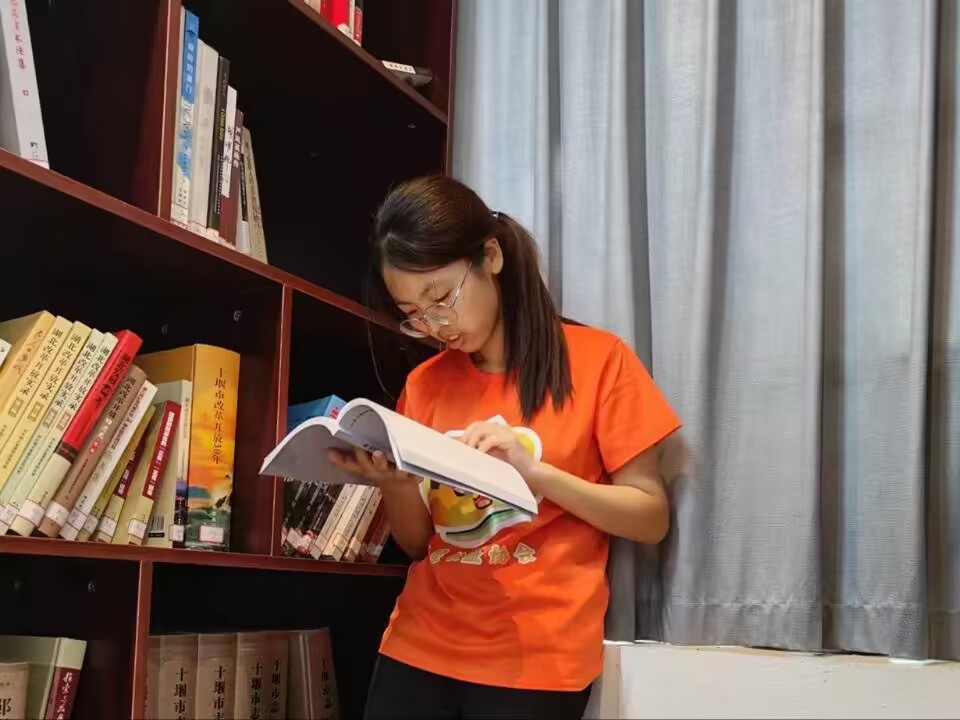 (支教队队员在纪念馆的书架前认真阅读书籍)