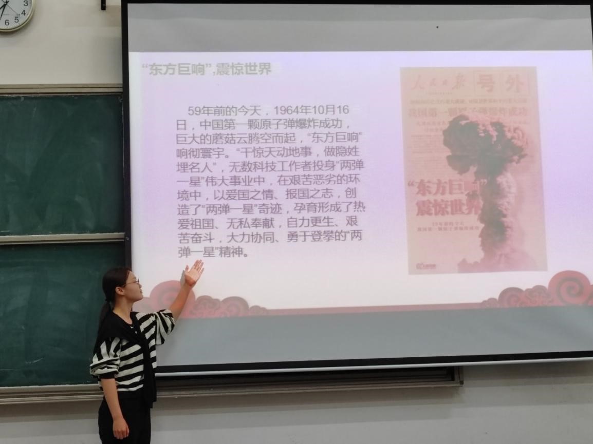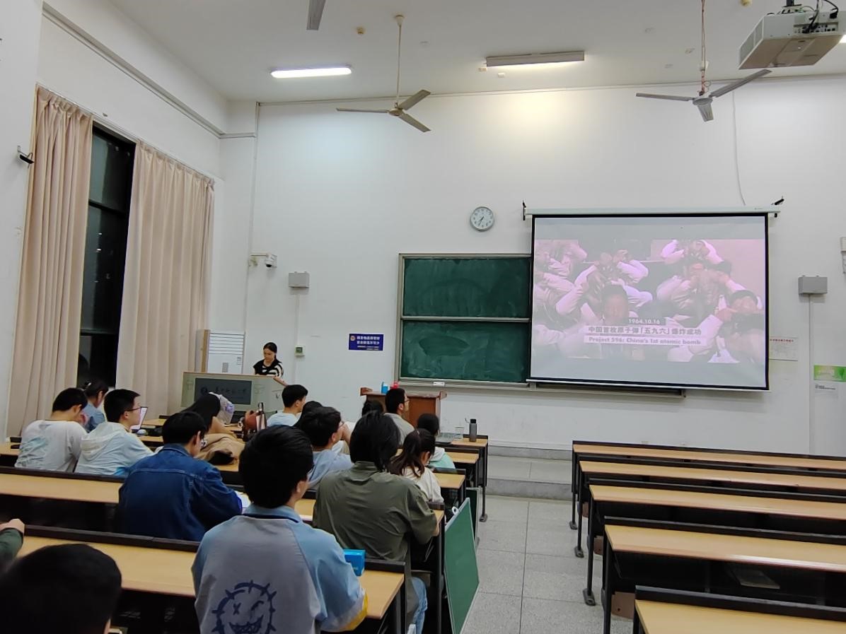 于慧馨向同学们介绍了“两弹一星”精神的来源及意义,指出“两弹一星”精神承载了新中国波澜壮阔的发展史与艰苦卓绝的奋斗史,凝聚了一代人的集体智慧与优良作风。与会同学共同观看了“两弹一星”制造纪实视频,对这段可歌可泣的历史有了更深刻的体会。