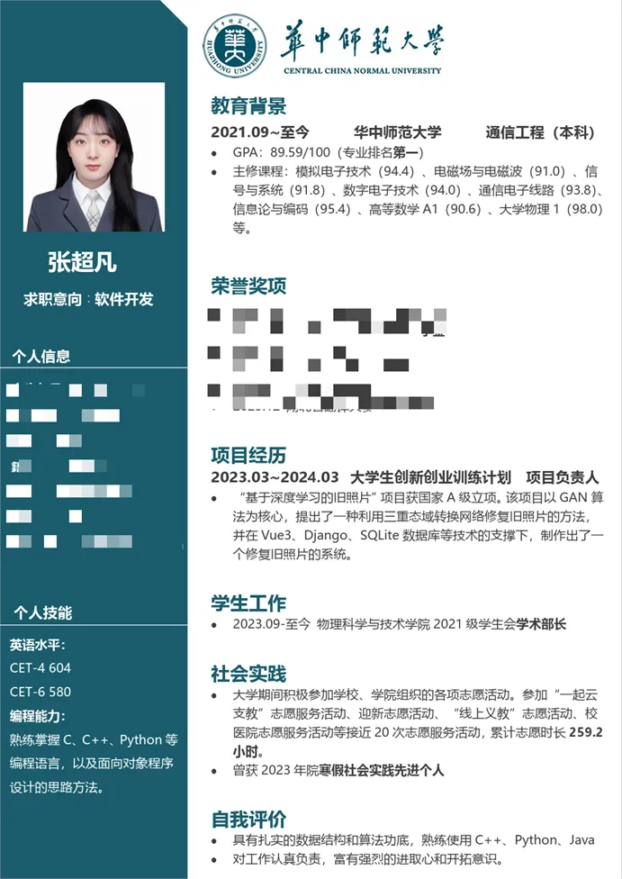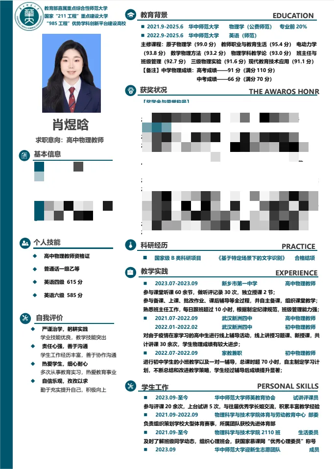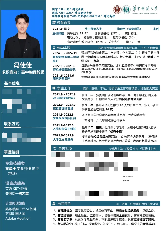 为提高同学们的简历制作水平和就业竞争力,进一步引导学生在大学阶段查漏补缺,为未来的职业生涯奠定坚实基础。物理科学与技术学院2021级本科生于2024年3月举办第二届“卓越师范生计划”之简历制作比赛。本次比赛共收到个人简历作品354 份,经评委线上打分评比,共产生一、二、三等奖若干,下面跟着小phy一起学习本次大赛的部分优秀简历作品吧!