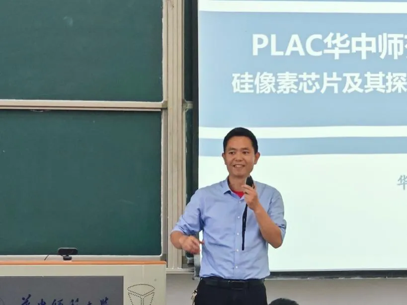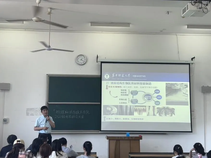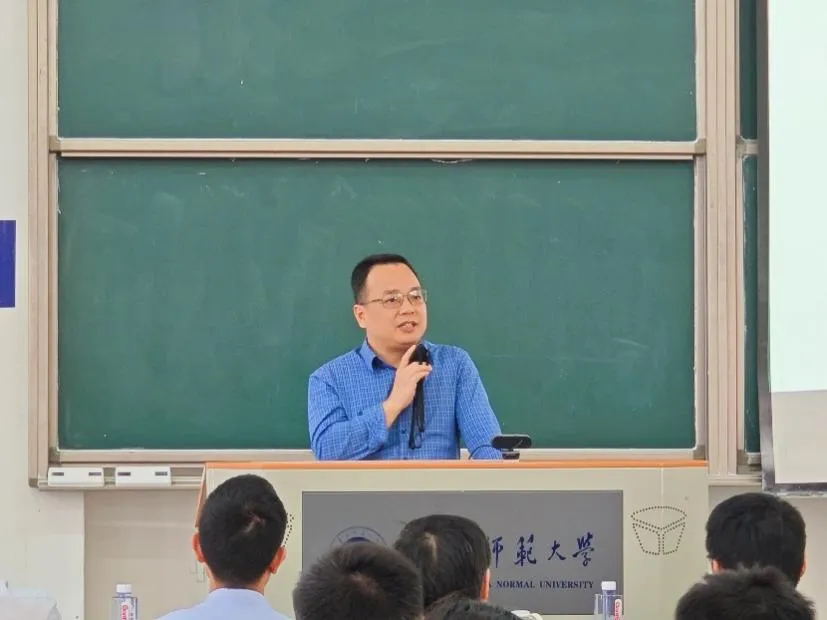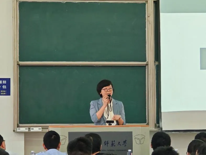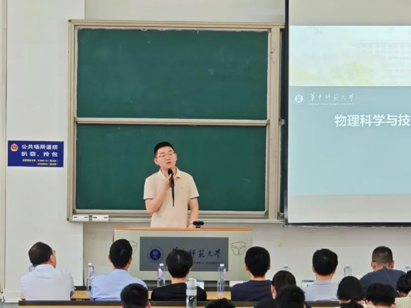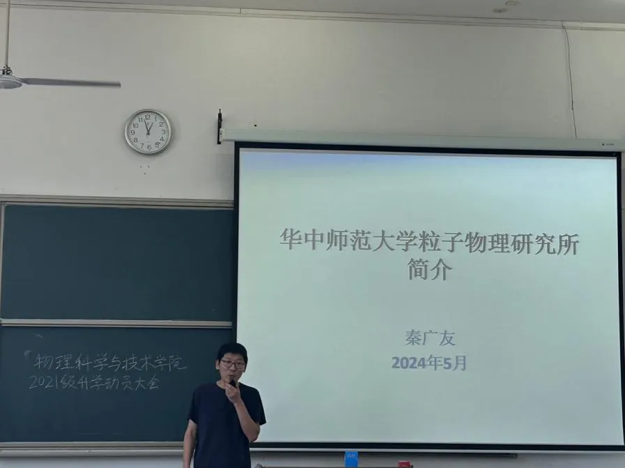 在师范专业会场,秦广友老师给同学们介绍华师粒子物理研究所研究方向、研究团队、学科平台、国内外合作交流、学生培养等相关情况。