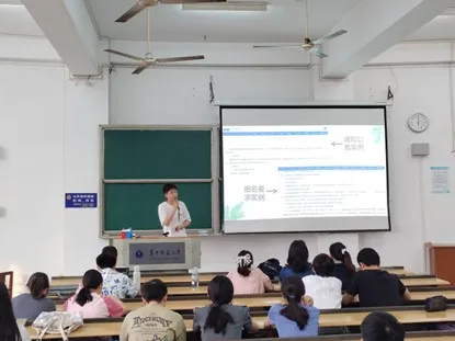 柴岳从招聘信息收集、简历制作、招聘流程、就业形势等方面进行讲解。重点讲到了广东省招聘应提前准备说课、试讲片段,以及对考题、压轴题要有一定了解。最后,柴岳结合其他学长姐的建议,提醒同学们讲课时要自信,讲课环节不能犯科学性的错误,要有清晰思路,也要注意将板书写工整。