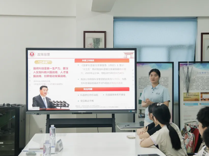 和嫣婷通过“社区科普实践的背景、策划、实施”三个环节进行交流分享。和嫣婷指出,学院坚持需求导向,开创“一老一小相结合”、“引进来和走出去相结合”的两条实践路径,落实人才、资源、项目、阵地“四位一体”的育人模式,举办“科技之光”物理实验室参观、“两弹一星”精神主题宣讲、“格物杯”时政知识竞答大赛等活动,以项目化方式完善日常科普志愿菜单。普及自然科学知识、提高全民科学素质、点亮科技强国梦想。