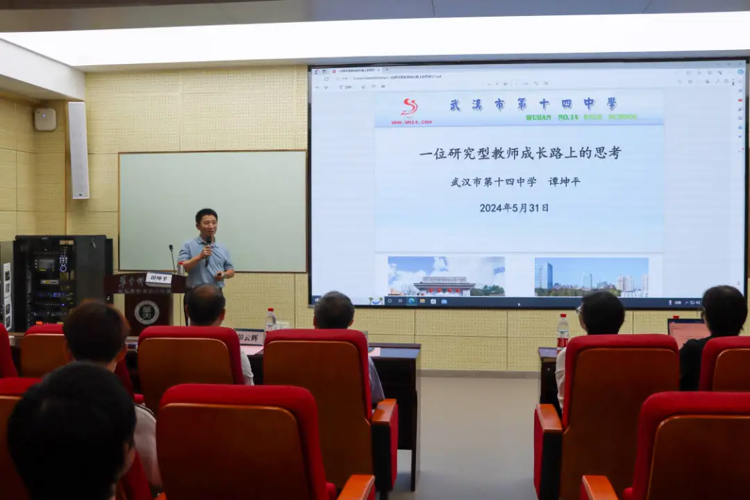 讲座中,谭坤平谈到,一名中学物理教师应从热爱教育做起。要因材施教,做研究型物理教师,从关注“教”向关注“学”转变,以做“师德的表率、育人的模范、教学的专家”为职业追求。在提到高中物理教师教学的规范与艺术时,他说应从教学有法,明确“一核”“四层”“四翼”到教无定法,课堂生成教学,渐进成长。同时,他还分享了作为一名研究型物理教师成长路上关于阅读、写作、研究、平台的思考。