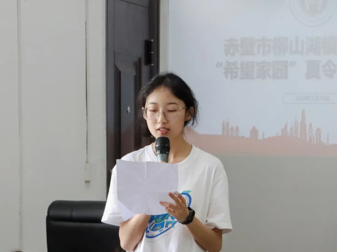 到达目的地后,实践队队员们按照小组分工,进行了周密的实践准备。7月16日上午,宝塔山村“希望家园”夏令营开班仪式在宝塔山村村委会举行,赤壁市柳山湖镇党委副书记李功胜、柳山湖镇纪委书记周瑜、驻村第一书记吴新宇、宝塔山村支部书记陈亮、全体“希望家园”夏令营学生、实践队全体队员和带队老师王棣参加本次仪式。仪式现场气氛热烈,领导嘉宾、参营学生及全体实践队员共同见证了这一重要时刻。