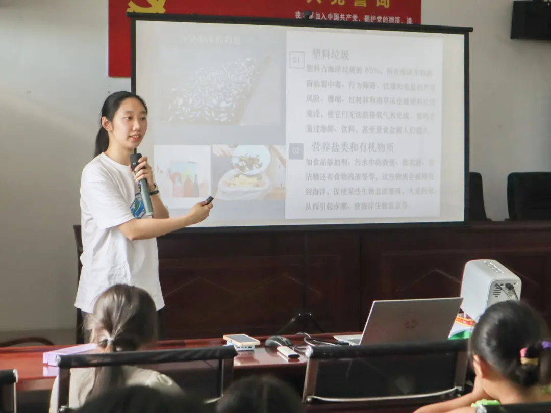 “我们每个人都生活在大陆上,但大海的神秘总是吸引着我们。”实践队队员王雅霖这样说。从陆地一步步潜入海洋,她通过生动的视频介绍了多种鱼类的相关知识,让学生们对海洋生物的多样性有了更深的认识。随后课堂主题转而聚焦于环境污染问题,触目惊心的图片直观又深刻地展现着海洋污染的严重性,在孩子们的心里种下海洋保护的种子,正是本节课的题中之义。