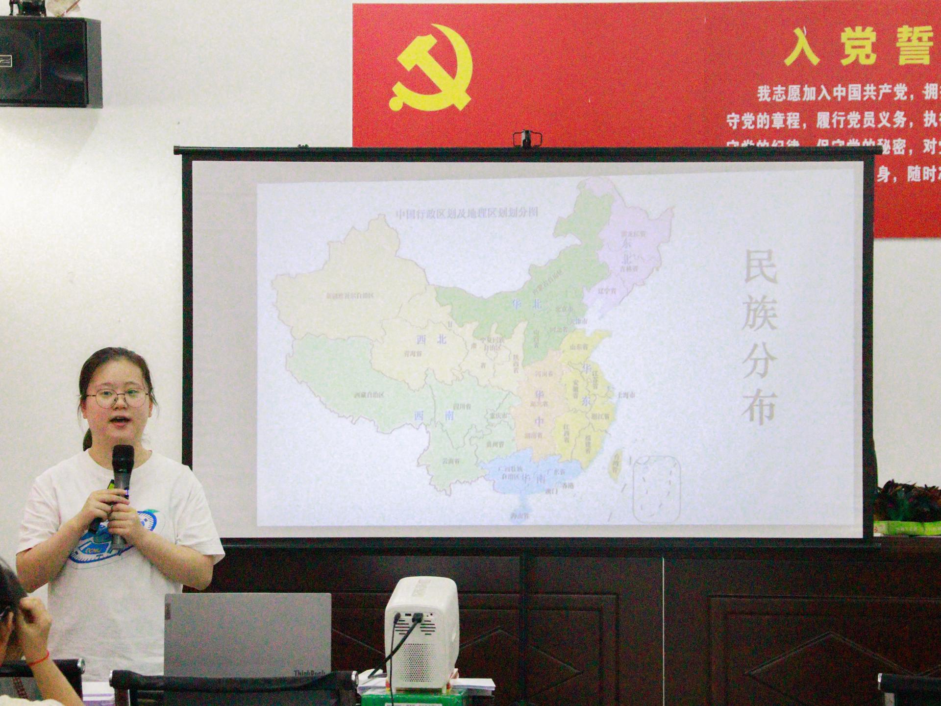 实践队队员沈综碧为孩子们带来了一堂别开生面的“中国各民族介绍”教学课,她以独特的视角引领孩子们踏上了一场精彩的民族探索之旅,共同领略了中国多元文化辉煌篇章中绚烂多彩的一隅。从土家族的摆手舞到维吾尔族的“十二木卡姆”,再到蒙古族的辽阔草原与悠扬长调,学生们在她栩栩如生的描述中,仿佛穿越了千山万水,亲身体验了各民族的风土人情。课堂上,学生们积极互动,不仅加深了对中国多民族大家庭的认识,更在心中悄然种下了民族团结与文化自信的种子。这堂课远远超越了一次简单的知识传授,它成为了一次深刻的心灵触动,让五彩斑斓的民族文化种子在孩子们的心田生根发芽,并将在未来的日子里茁壮成长,绽放出耀眼夺目的文化之花,照亮他们探索世界的每一个角落。