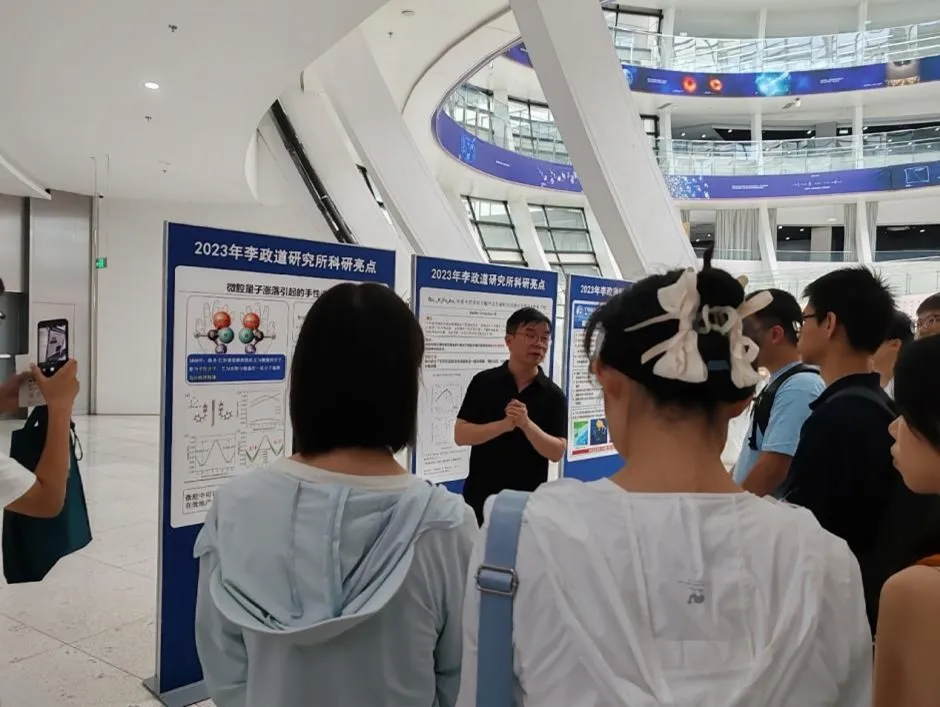 最后,李晟带领实践队来到展板前面,向队员们讲解2023年李政道研究所的科研亮点。此次活动让队员们感受到了李政道研究所的科研实力,对粒子物理、量子物理、天体物理、凝聚态物理等多个物理方向的前沿有了更为全面的认识。