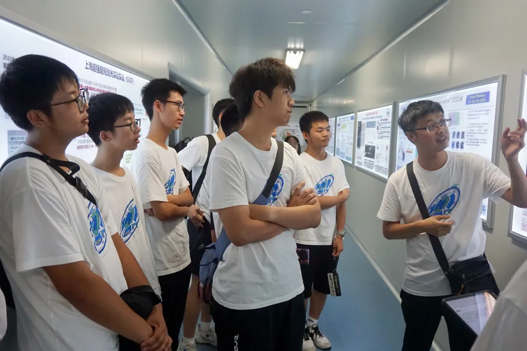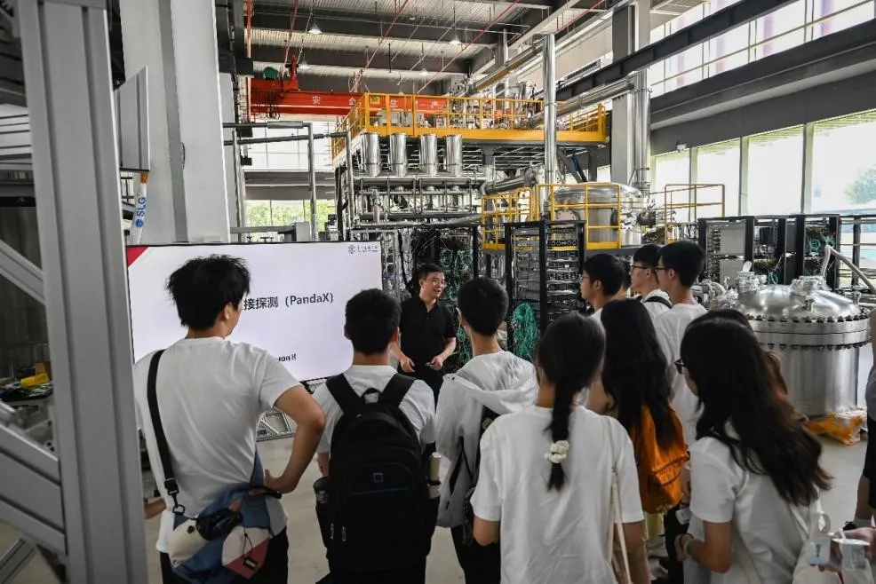 实践队来到粒子实验大厅。李晟讲解PandaX项目组的创立以及研究内容。他展示了作为研究暗物质的实验小组的PandaX在锦屏山之中的实验环境和利用液氙测量暗物质的原理,并利用发表在《nature》上的实验数据向实践队队员们展示PandaX实验小组的科研成果。李晟还特别介绍了“海铃计划”——由李政道研究所发起并牵头,旨在探索建设中国首个深海中微子望远镜的前沿科学项目。