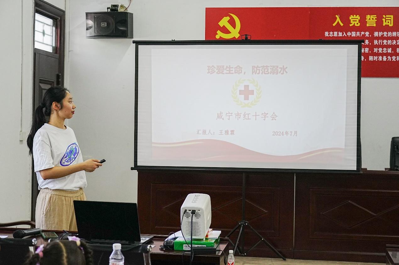 宝塔山村位于湖北省赤壁市柳山湖镇东南部,稻虾共作是全村移民主要经济收入来源之一,村中多池塘、稻田,溺水事故易发。受咸宁市红十字会所托,实践队队员王雅霖特别准备了主题为“珍爱生命 远离溺水”的水域安全宣传教育活动,为同学们详细讲解了防溺水的安全要点、注意事项、如何第一时间自救、如何互救,并提醒孩子们不要到河边玩耍、游泳,不要接近危险水域,严防意外事故的发生。