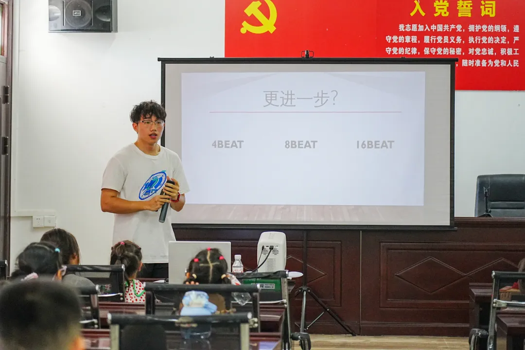实践队队员范荣博开展了节奏盒子(B-Box)教学。他从节奏盒子基础三音“不”、“次”、“卡”开始,逐步将这些单音串成完整的片段。他指出节奏盒子的音节组合的灵活性,并且加上各种发声技巧后可以模拟出不同的乐器声。之后孩子们也遵从范荣博的指导开始尝试,掌握了不错的节奏感。课程最后,范荣博还为大家带来了一段精彩绝伦的节奏盒子音乐表演,他巧妙地将各种音节和发声技巧融合在一起,模拟出了各种乐器的声音,演绎出一首首动人心弦的音乐作品。