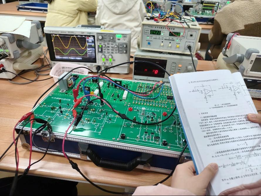 马晶晶同学也分享了自己的实验心得:“这次班会可以让我们通过实验操作来锻炼自己的动手能力,补足自己的薄弱地方,对专业学习有很大帮助。在这次班会上我做了电压比较器实验,通过在实验箱上连接电路并输入信号,用双踪示波器测量输入、输出信号,观察波形,我充分了解了电压比较器的工作原理。”