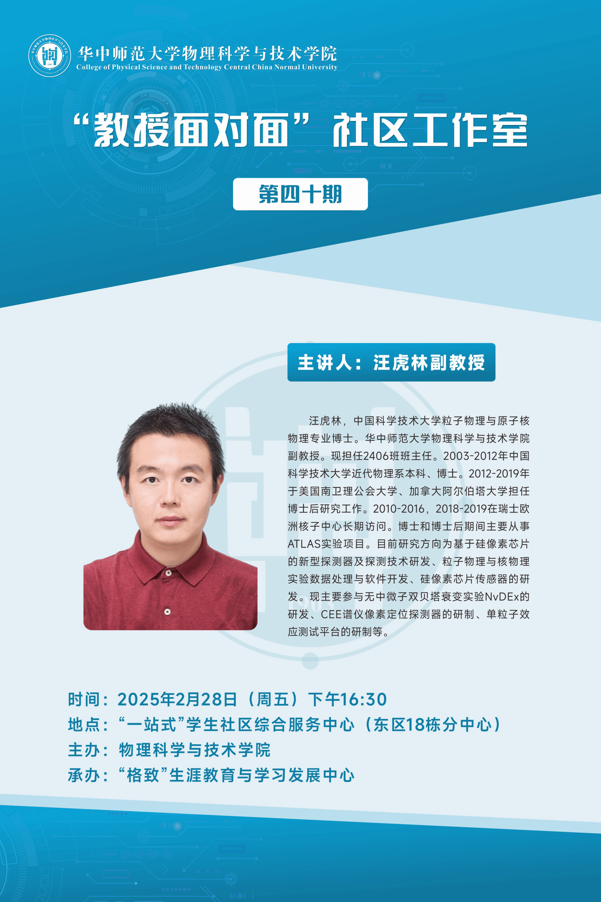 汪虎林,中国科学技术大学粒子物理与原子核物理专业博士。华中师范大学物理科学与技术学院副教授。现担任2406班班主任。2003-2012年中国科学技术大学近代物理系本科、博士。2012-2019年于美国南卫理公会大学、加拿大阿尔伯塔大学担任博士后研究工作。2010-2016,2018-2019在瑞士欧洲核子中心长期访问。博士和博士后期间主要从事ATLAS实验项目。目前研究方向为基于硅像素芯片的新型探测器及探测技术研发、粒子物理与核物理实验数据处理与软件开发、硅像素芯片传感器的研发。现主要参与无中微子双贝塔衰变实验NvDEx的研发、CEE谱仪像素定位探测器的研制、单粒子效应测试平台的研制等。