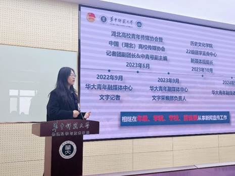 谈及新闻创作,薛雨欣从新闻的定义与要素切入,结合实例,剖析标题提炼、导语撰写、主体逻辑搭建等环节的规范要点,并详尽梳理了稿件外投的注意事项。从融媒体“小白”成长为团队总编,薛雨欣认为,校园记者应着重培养共情力与批判性思维,成为技术浪潮中“有思想的舵手。“我们要成为一个有思想、有责任、有能力、有情怀的校媒人。”