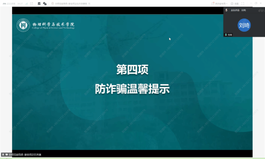 谢雨村针对新生入学时间、报到安排及必备物品准备等事项进行说明;刘琦为新生及家长做防诈骗温馨提示,提醒大家警惕迎新期间可能出现的骗局、规避风险,并布置军训相关安排。
