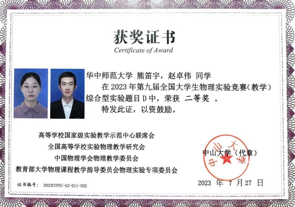 暑假期间熊笛宇参加了学院举办的物理学“拔尖2.02023年国际暑期学校,并顺利结业。在这次学习过程中,从最初的课程听不懂、代码看不懂,到对课程内容有所理解、代码运行成功,她认为自己取得了不小的进步。期间,她还一直在准备湖北省物理实验创新竞赛,并在第八届 “飞梦达杯”湖北省大学生物理实验创新设计竞赛中取得二等奖的好成绩。在创新赛结束后,她又立马投身到物理实验比赛教学赛的备赛中去,最终与2020级赵卓伟同学共同获得第九届全国大学生物理实验竞赛(教学赛)二等奖。两段竞赛经历,不仅让她学到了很多物理实验的知识和技能,还培养了她的团队合作能力和问题解决能力。在创新实验竞赛中,通过设计实验仪器,她学会了如何选择并搭建仪器。在实验教学竞赛中,她熟练掌握了一些实验操作的技巧并学会了处理和分析实验数据。熊笛宇坦言:“这两次的比赛教会了我‘合作’的意义。在比赛过程中,我需要与队友密切配合,共同完成实验任务。在这个过程中,我学会了如何与他人沟通和协作,如何分工合作,并且学会了如何在团队中发挥自己的优势。”