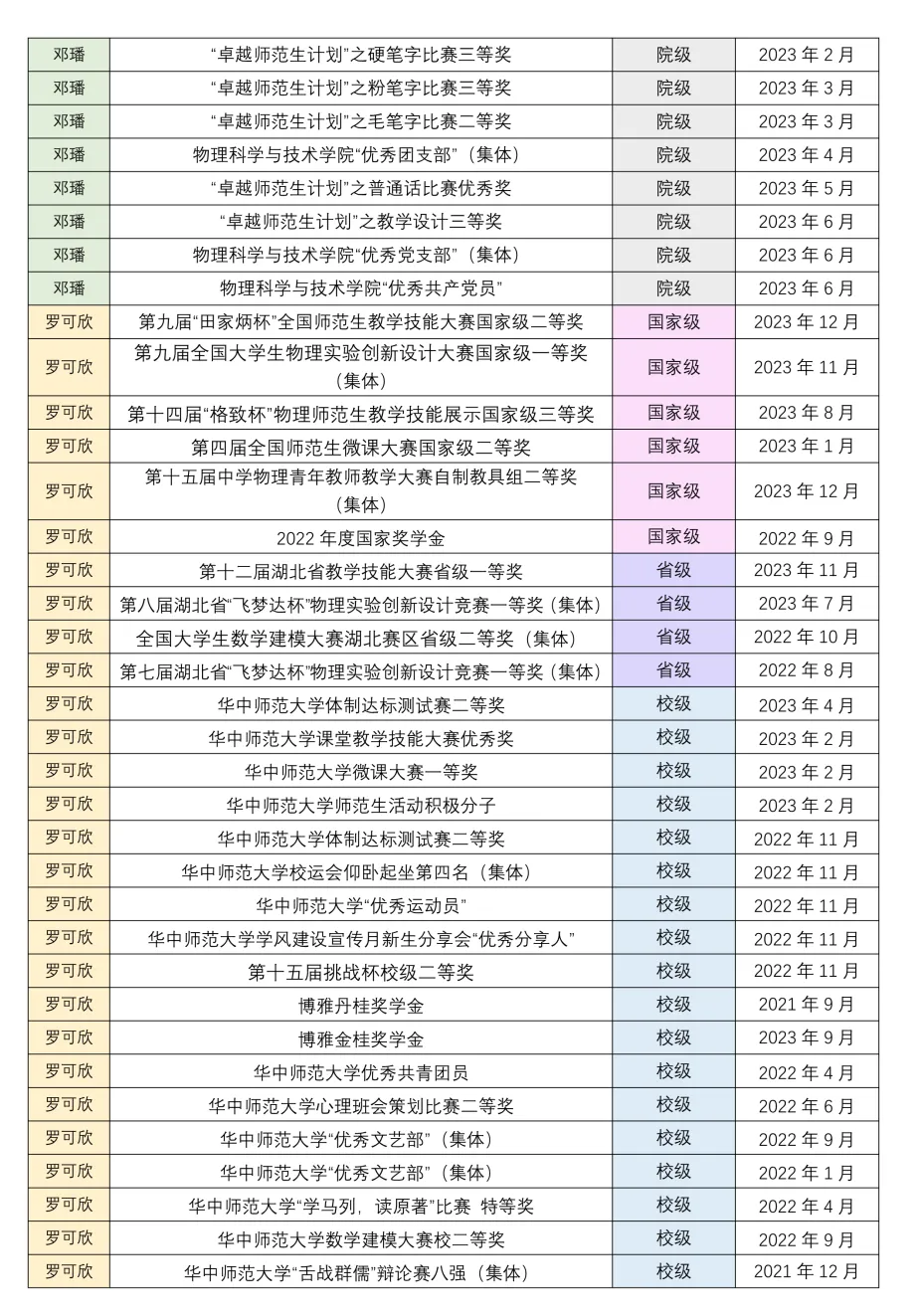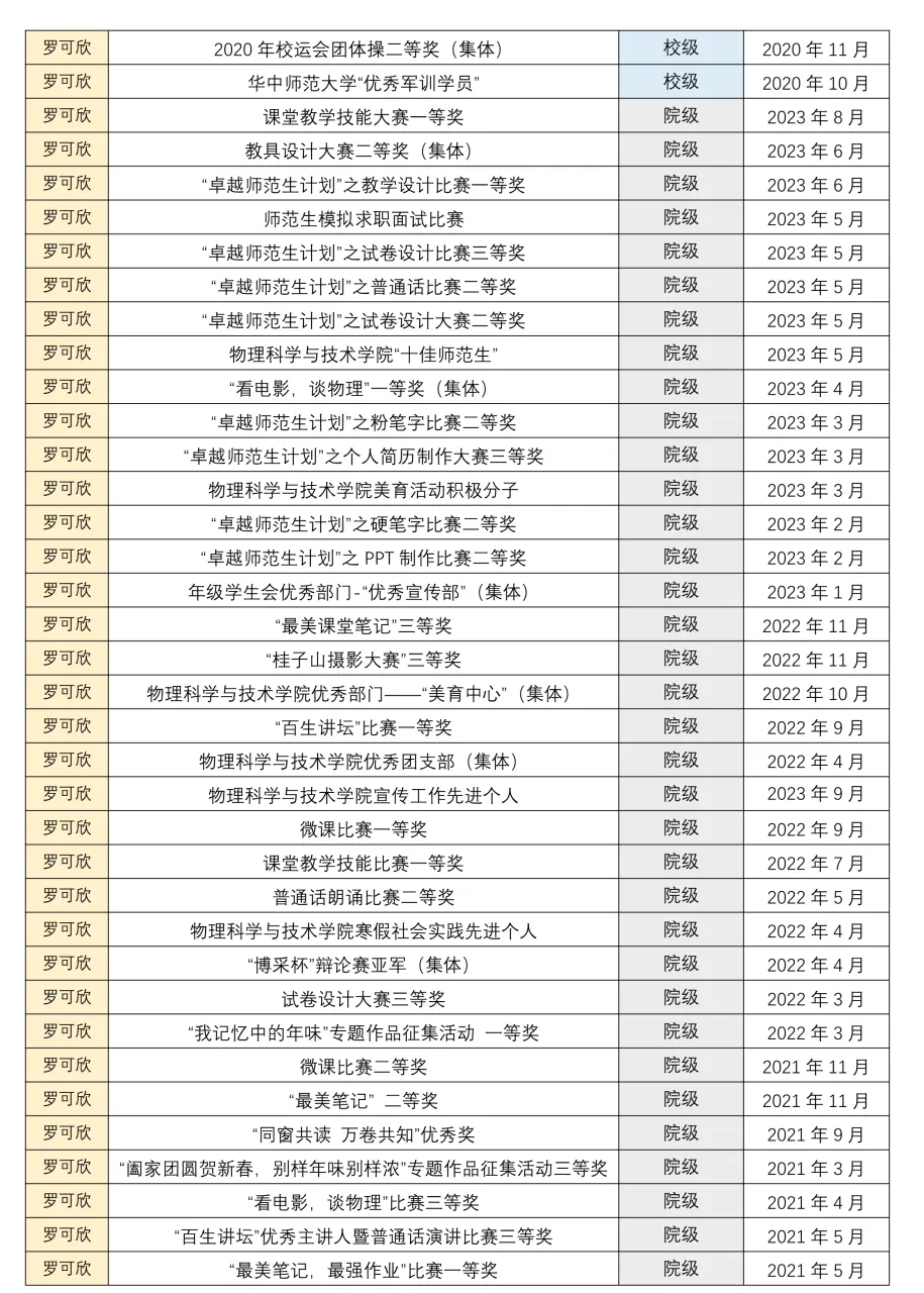 罗可欣作为全能型“学霸”,不仅在2021-2022学年物理学(师范)专业平均学分绩和综合成绩排名均为第一,更是在科研、竞赛、舞蹈、摄影、辩论、社会实践等方面全面发展。她曾任院学生会美育中心副主任、华大物院辩论队副队长、院融媒体中心干事,现任年级学生会宣传部部长,曾参与物理方向国家级A级科研项目、全国大学生数学建模大赛、物理实验创新设计大赛等多个竞赛。在师范技能竞赛领域,收获了从国家级到院级各类比赛的荣誉。她获得的奖项不仅仅是她出色能力的证明,更是她向着“更优秀”进发的脚印。她热爱公益,曾参与过跨国英语支教志愿活动,获得“国际志愿者”称号。她也积极参与学院活动,从迎新晚会到校主持人大赛,罗可欣都积极参与,在自己热爱的领域发光发热。